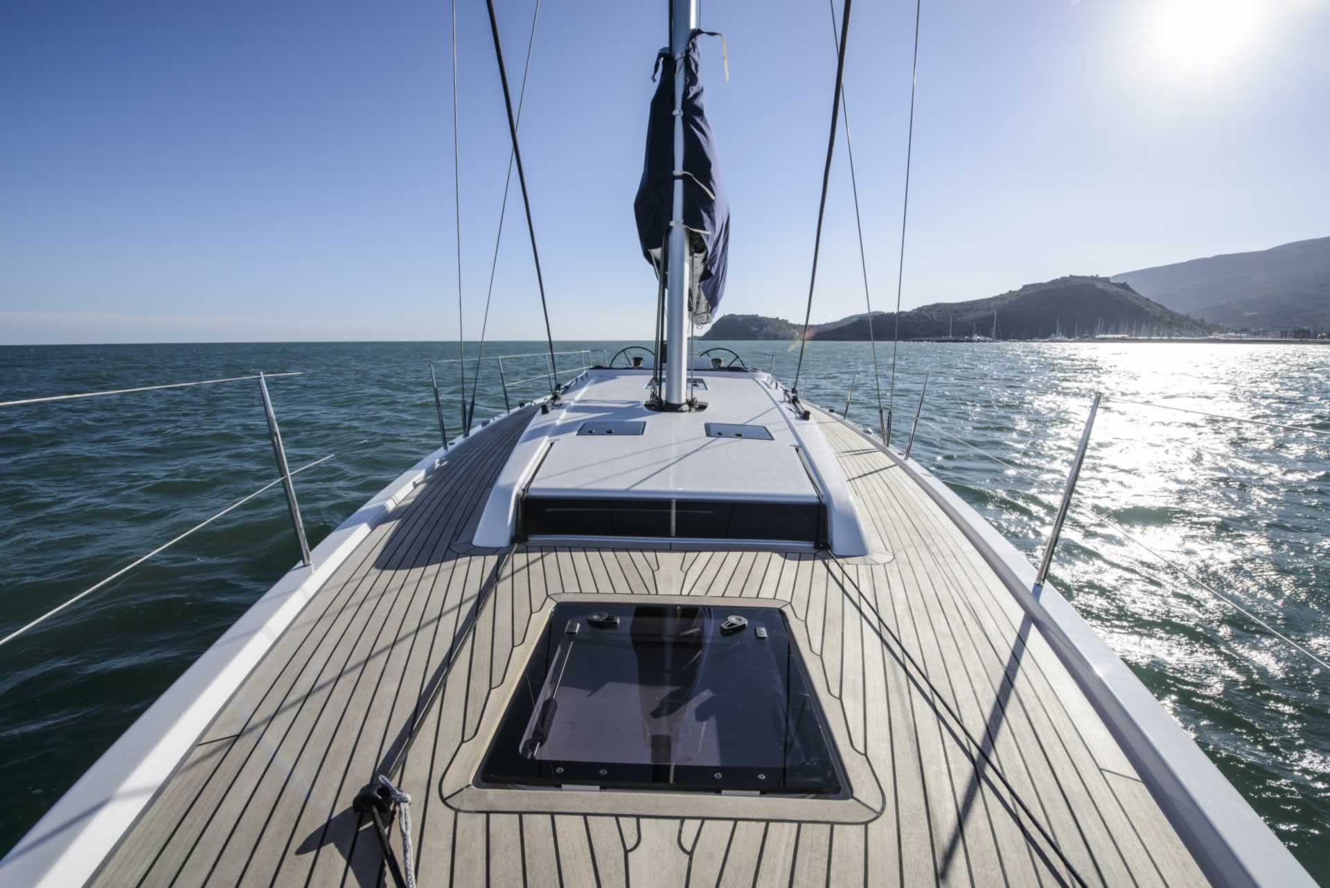 Two other popular options are a carbon bowsprit in either white painted finish or clearcoat black, with the additional option of an integrated anchor fitting. The sprit enables a full sail wardrobe of asymmetric spinnakers and reaching Code Zeros to be carried, particularly when racing under IRC. The anchor fitting is neatly concealed under the sprit.