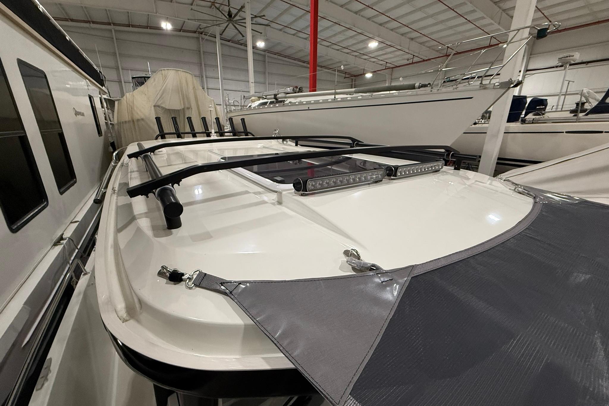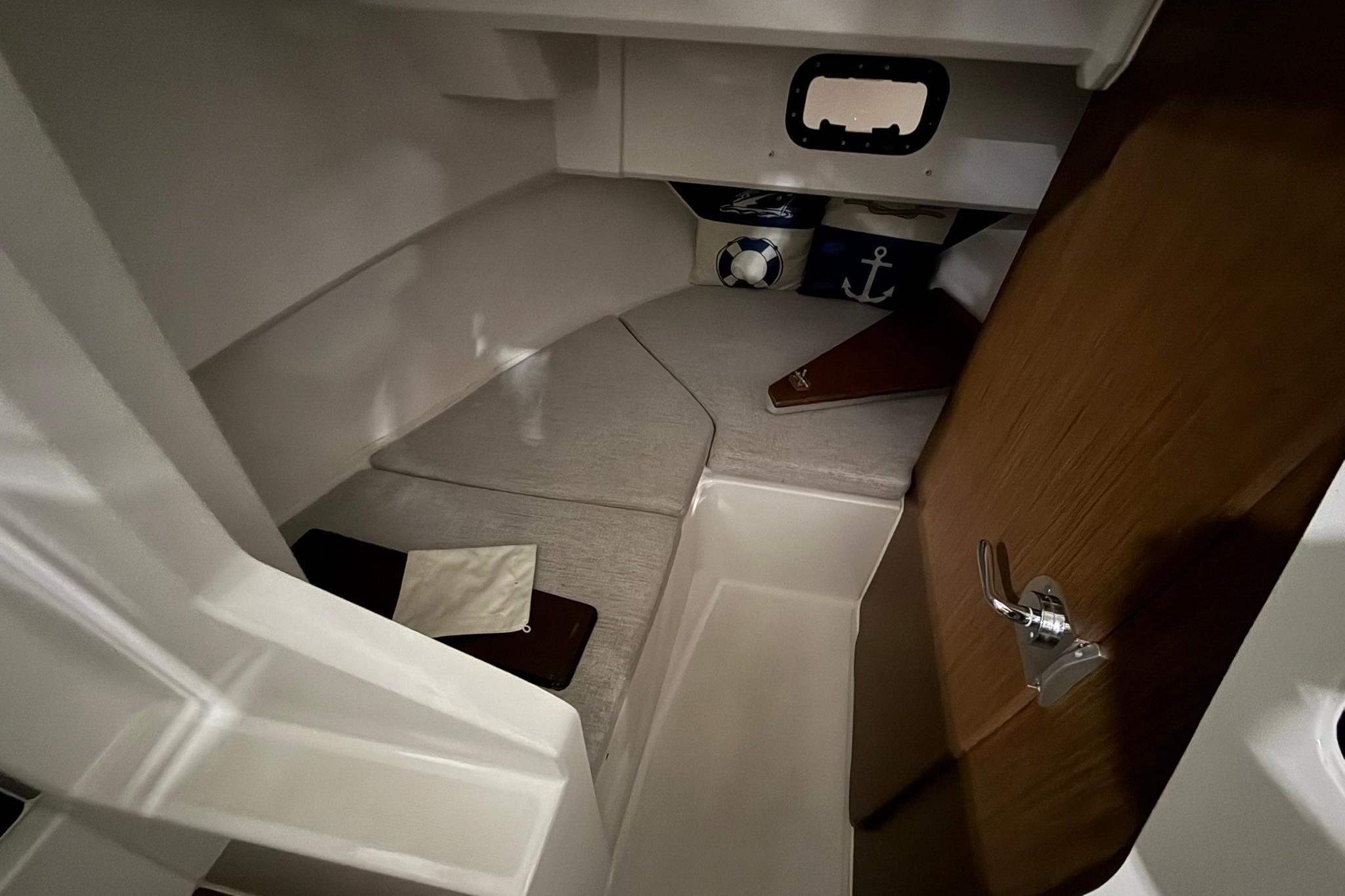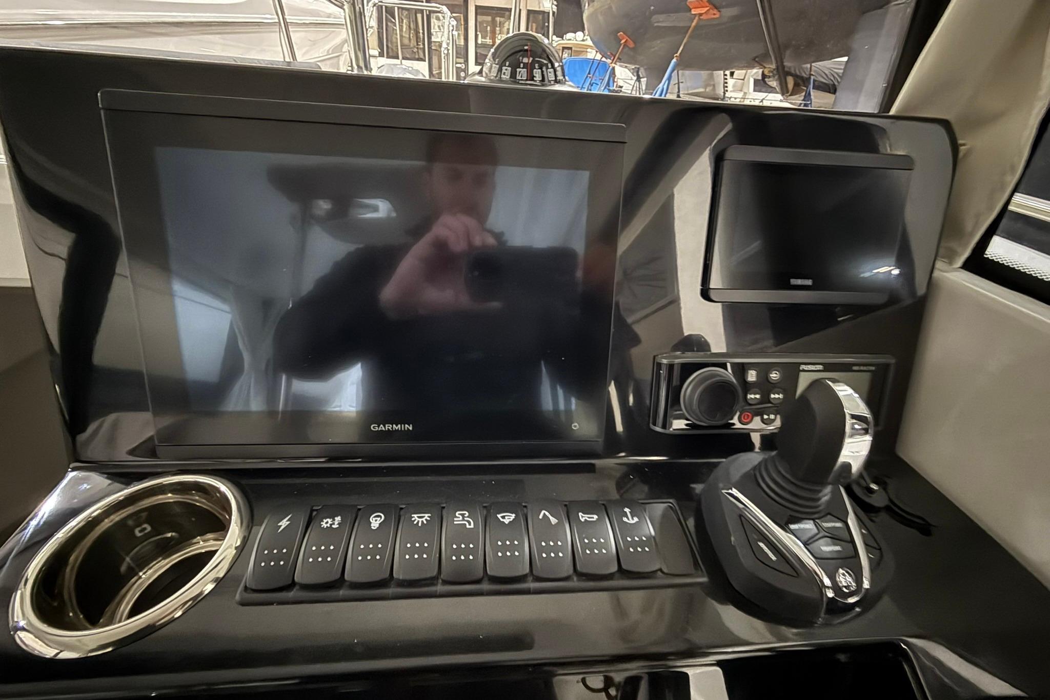 The secure side decks, enclosed wheelhouse, and convertible cockpit layout make it equally suited for early-season runs or autumn getaways. Equipped with a Yamaha 250, Garmin navigation, Sleipner bow thruster, and Zipwake trim system, it performs with total confidence on the water.