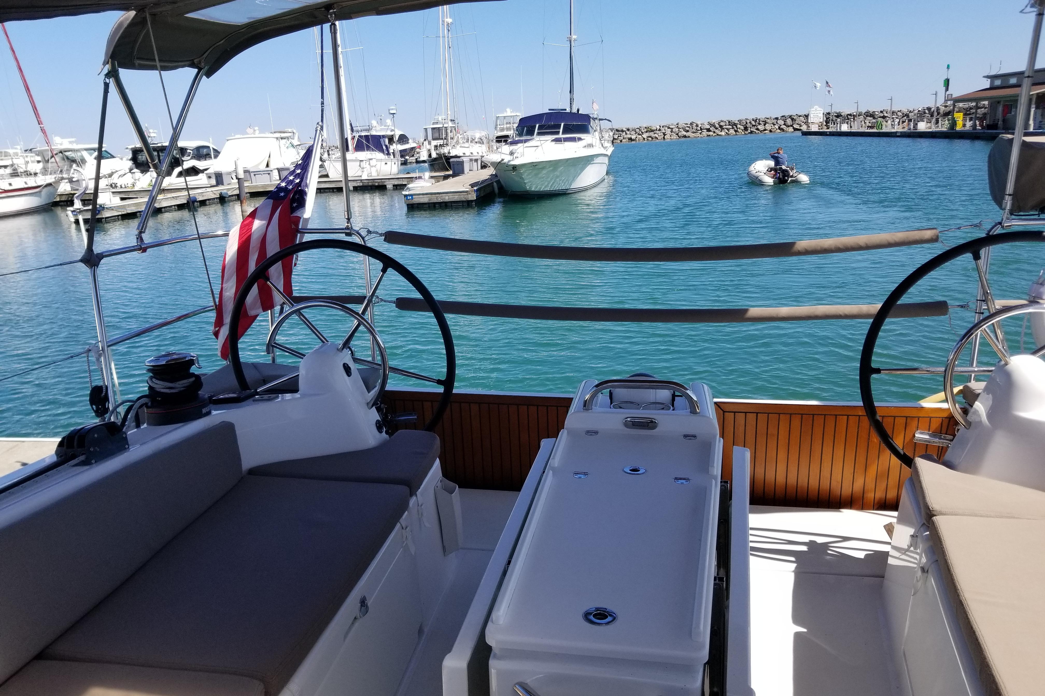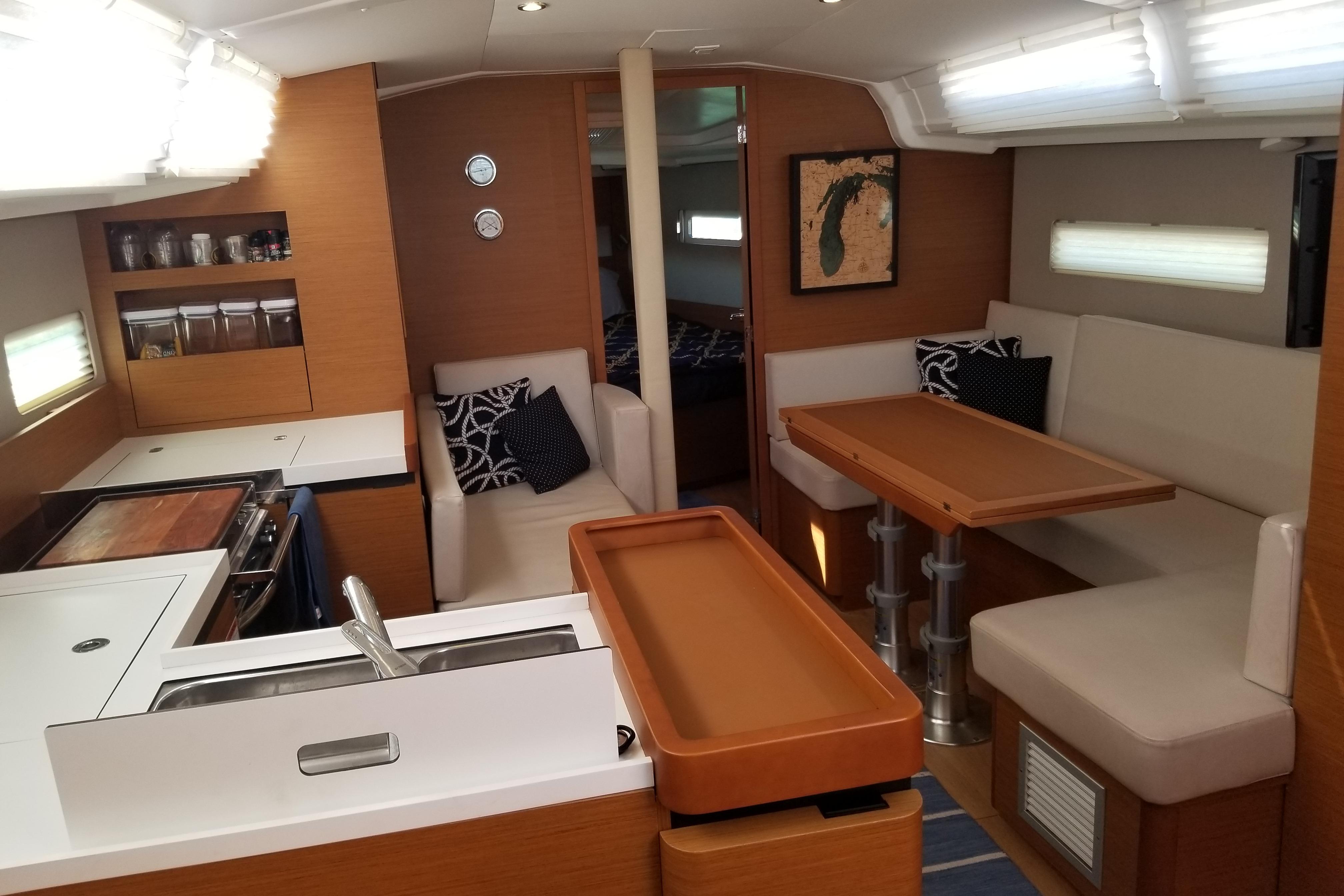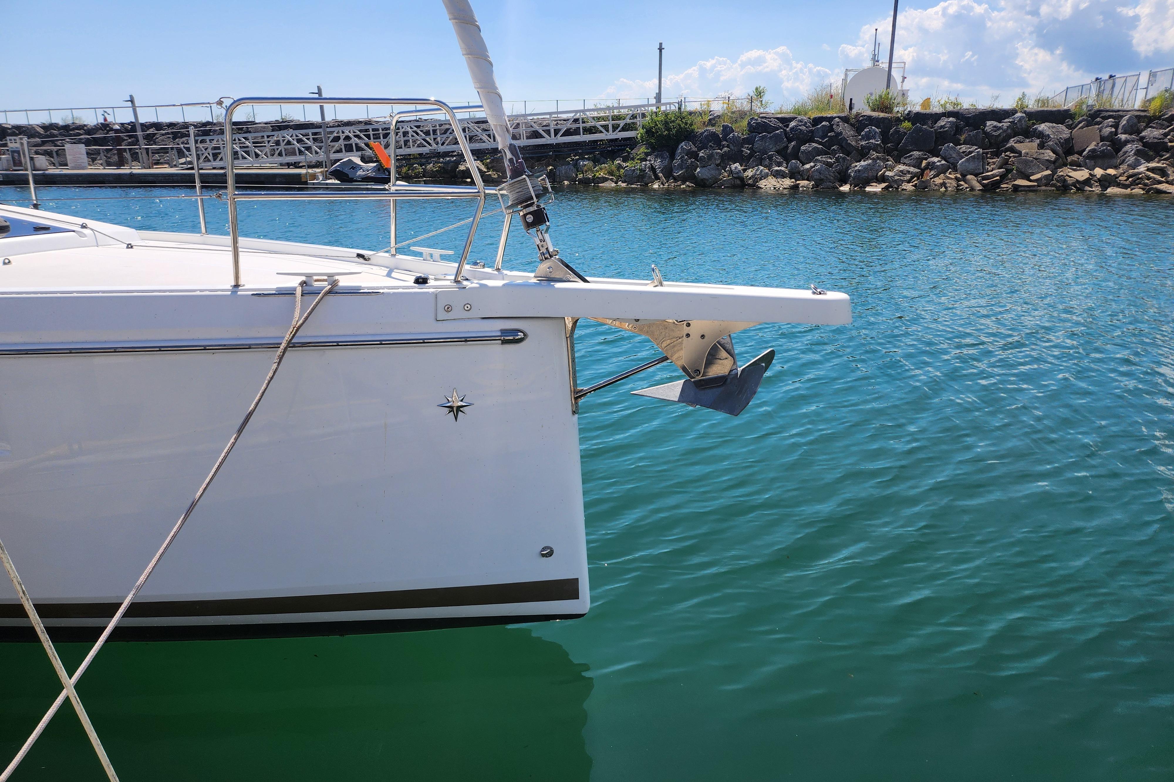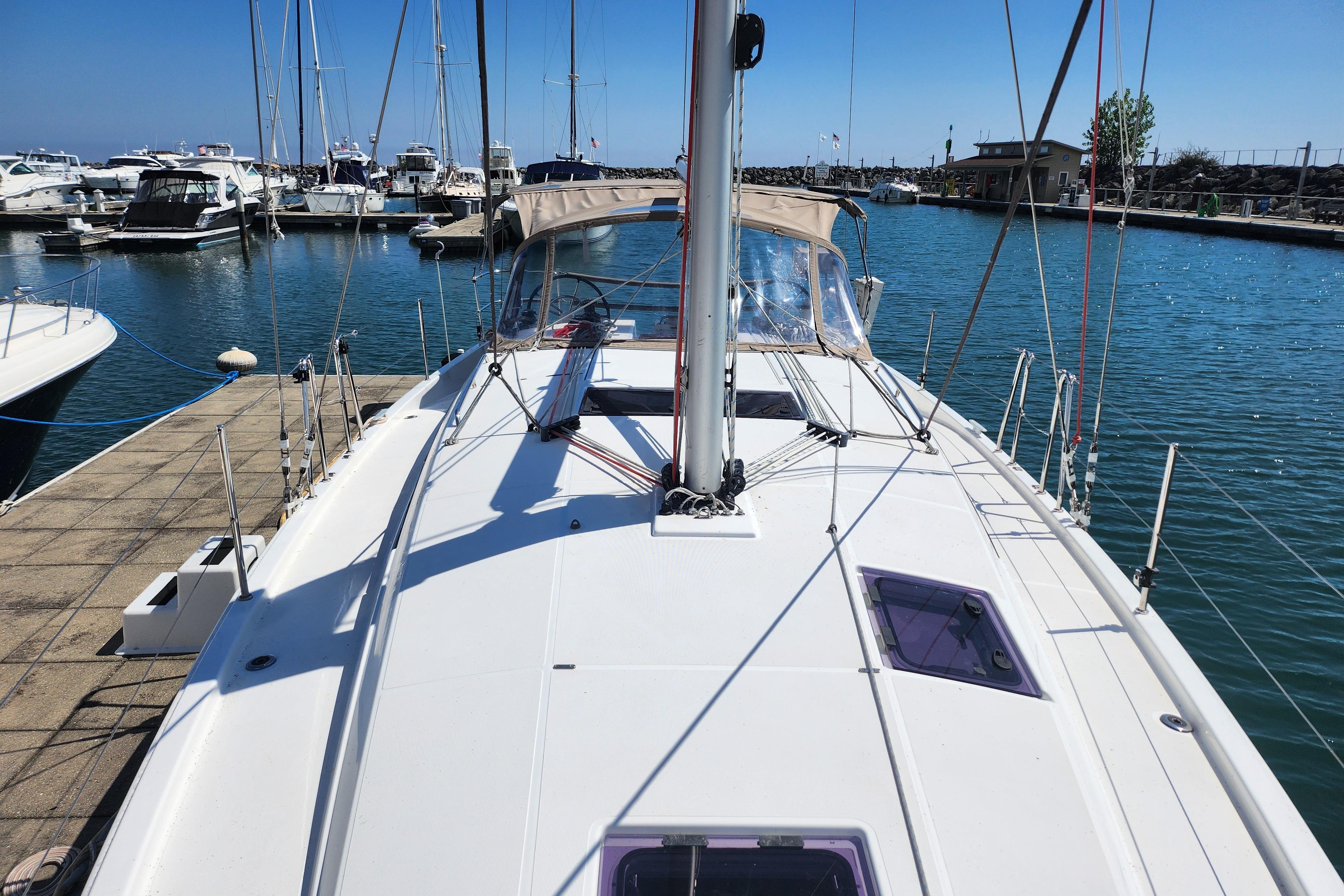 This Jeanneau 410 has won numerous design award in Europe and the US. Designed by Marc Lombard, with the cooperation of interior designer Jean-Marc Piaton, the new 410 Sun Odyssey meets the challenge of combining contemporary features and aggressive hull design into a harmonious, luxury cruiser. Sailing was never so enjoyable aboard a 41-foot sailboat. "RONDEAU" is no exception! This "FRESHWATER" 2 cabin 2 head version offers a cavernous storage area/ workshop that could be converted to a third cabin if needed. With her powerful hull she perfects the art of sailing and comfort on board. The model is particularly secure, featuring walk around sloping side decks without obstacles and a comfortable coaming. The interior is at once surprising and consistent with the Sun Odyssey line, where innovation serves to heighten the aesthetic and the level of comfort. Two cabin / two head layout allows for high capacity cruising and the performance based hull will get you to your cruising ground timely and in great style! A bow thruster and sufficient 45 HP Yanmar diesel make her a joy around the dock!