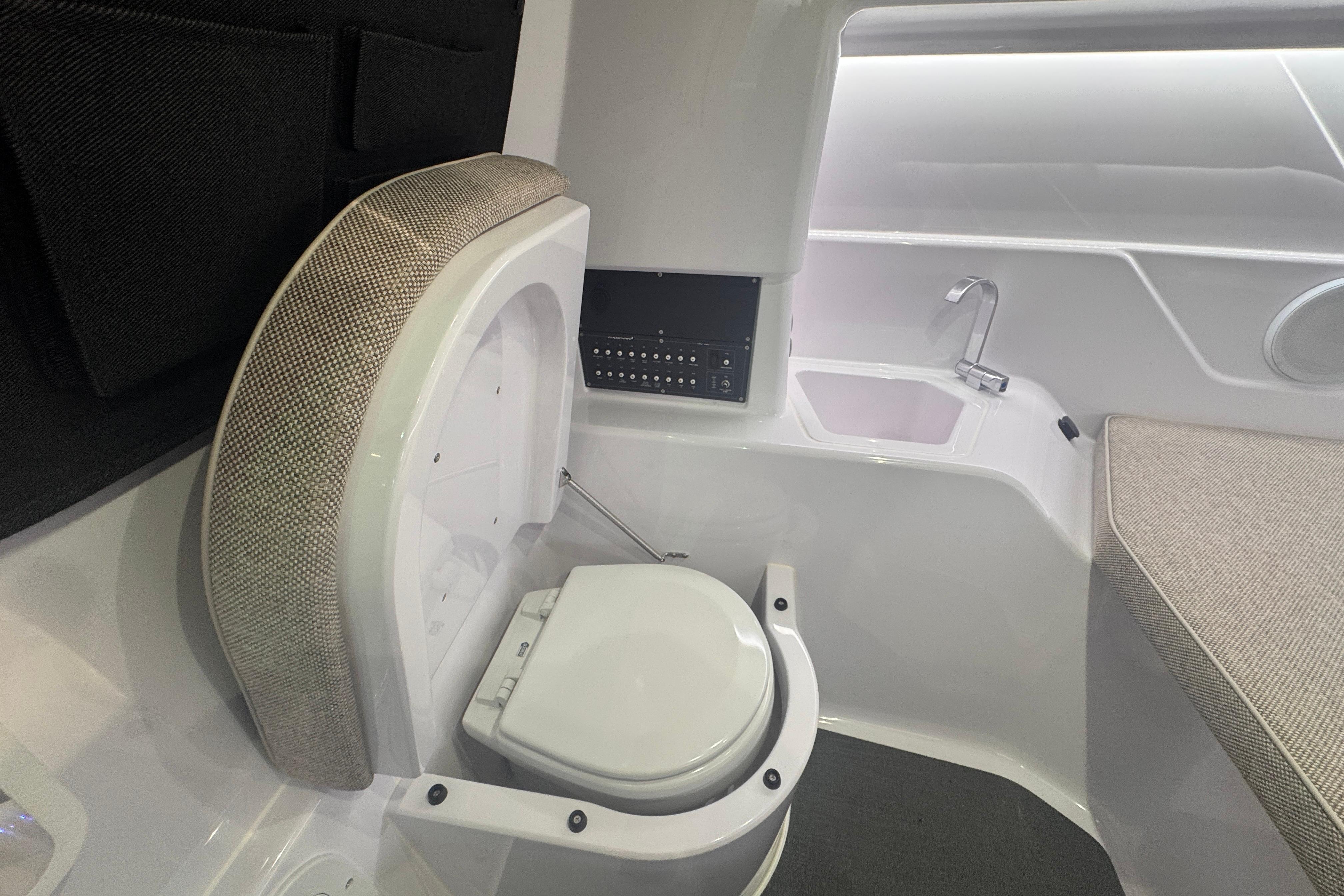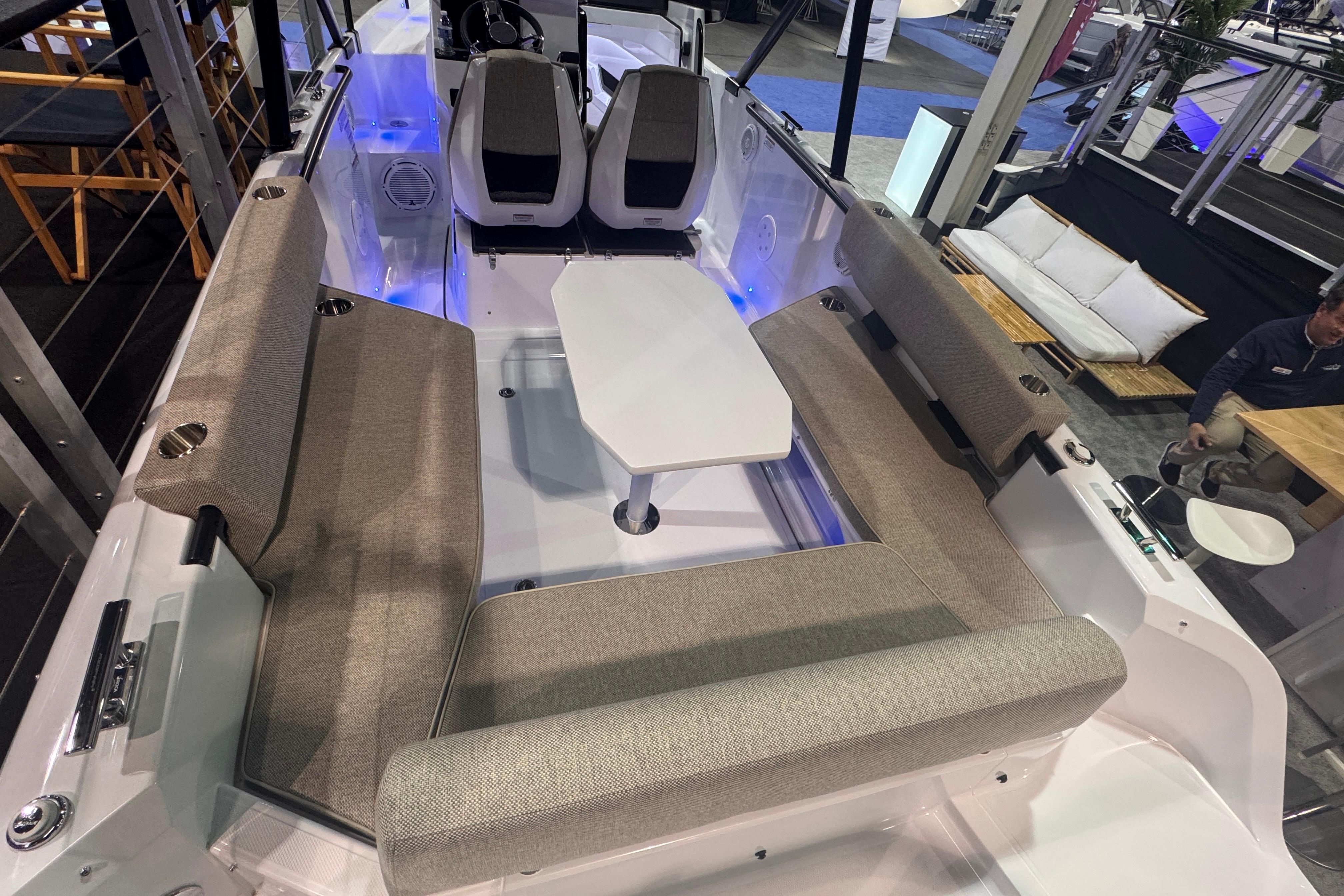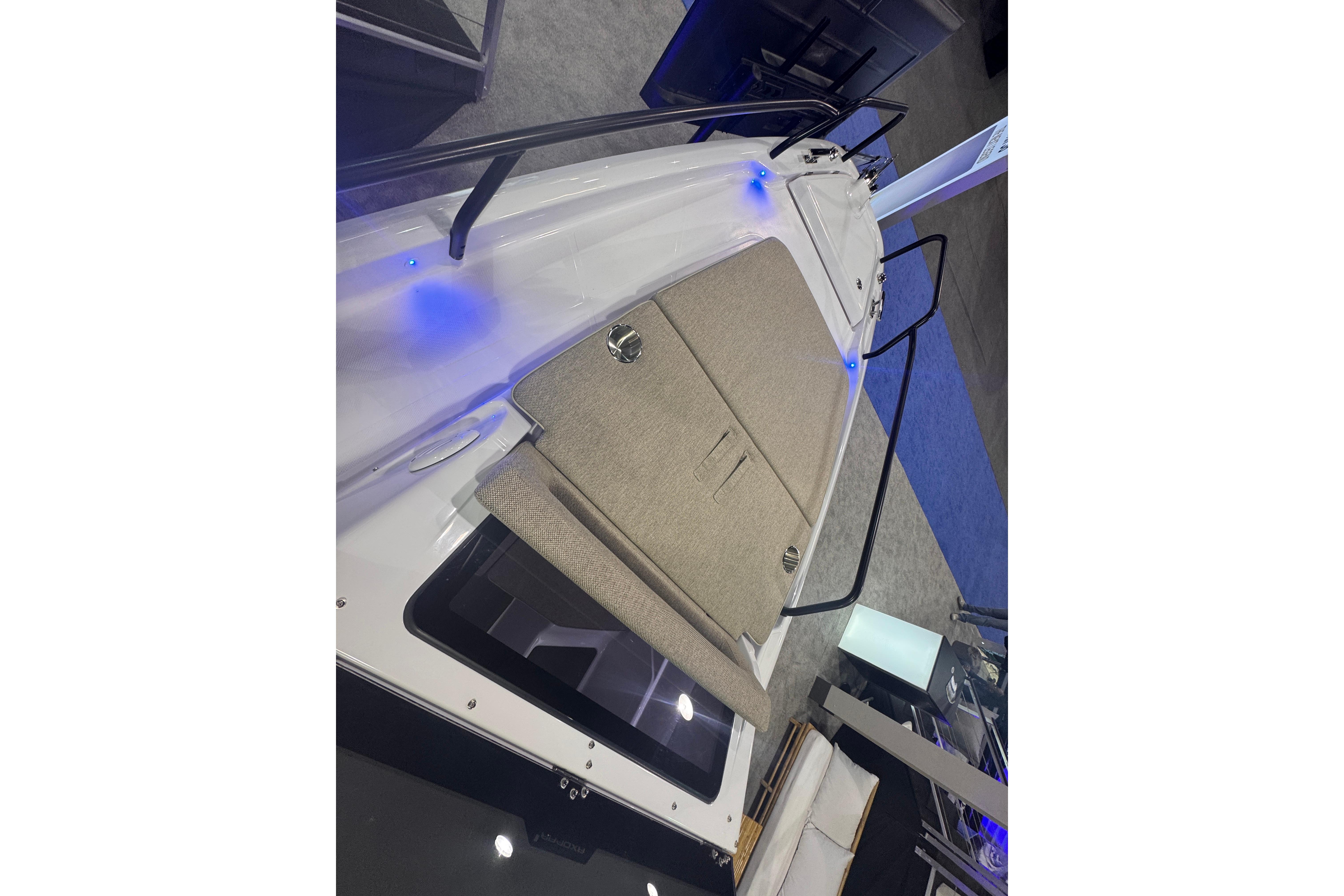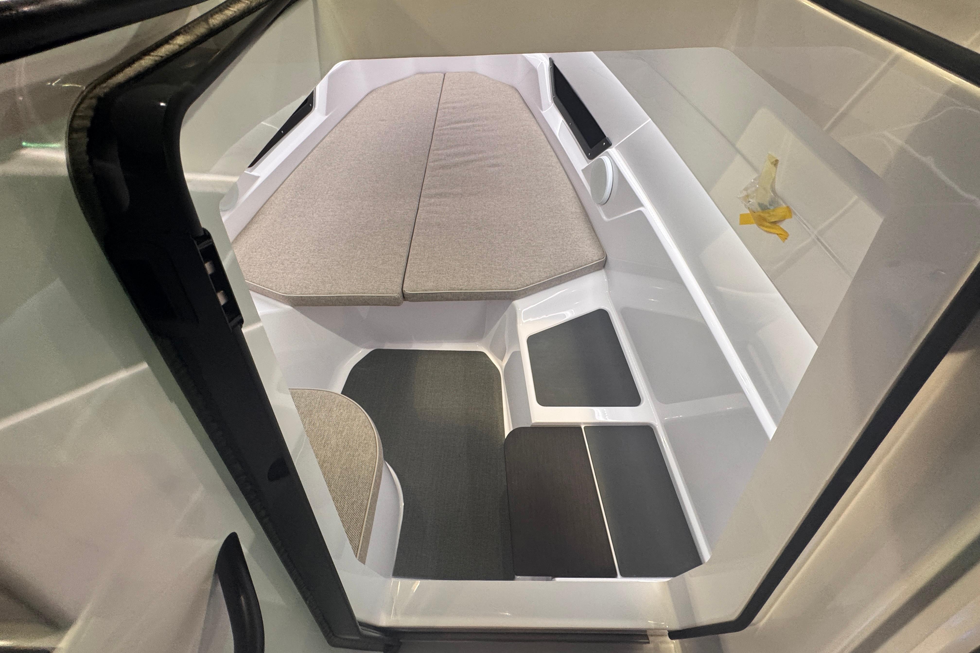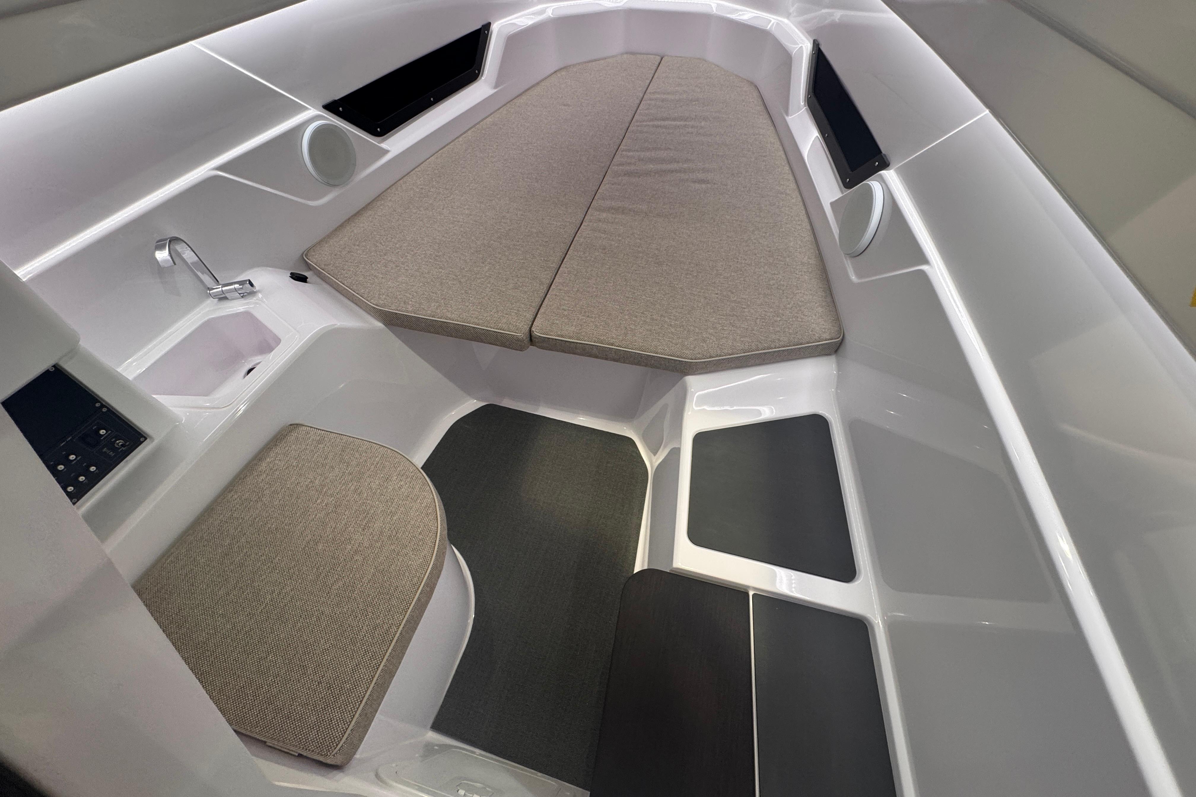 The ultra-cool looking Axopar 25 Cross Bow has a raised ‘cuddy cabin’ sleeping accommodation, where the cabin defines the character of this remarkable new boat. A full width cushioned sundeck is positioned atop the cabin roof, with a sloping back rest that follows the rake of the front screen.