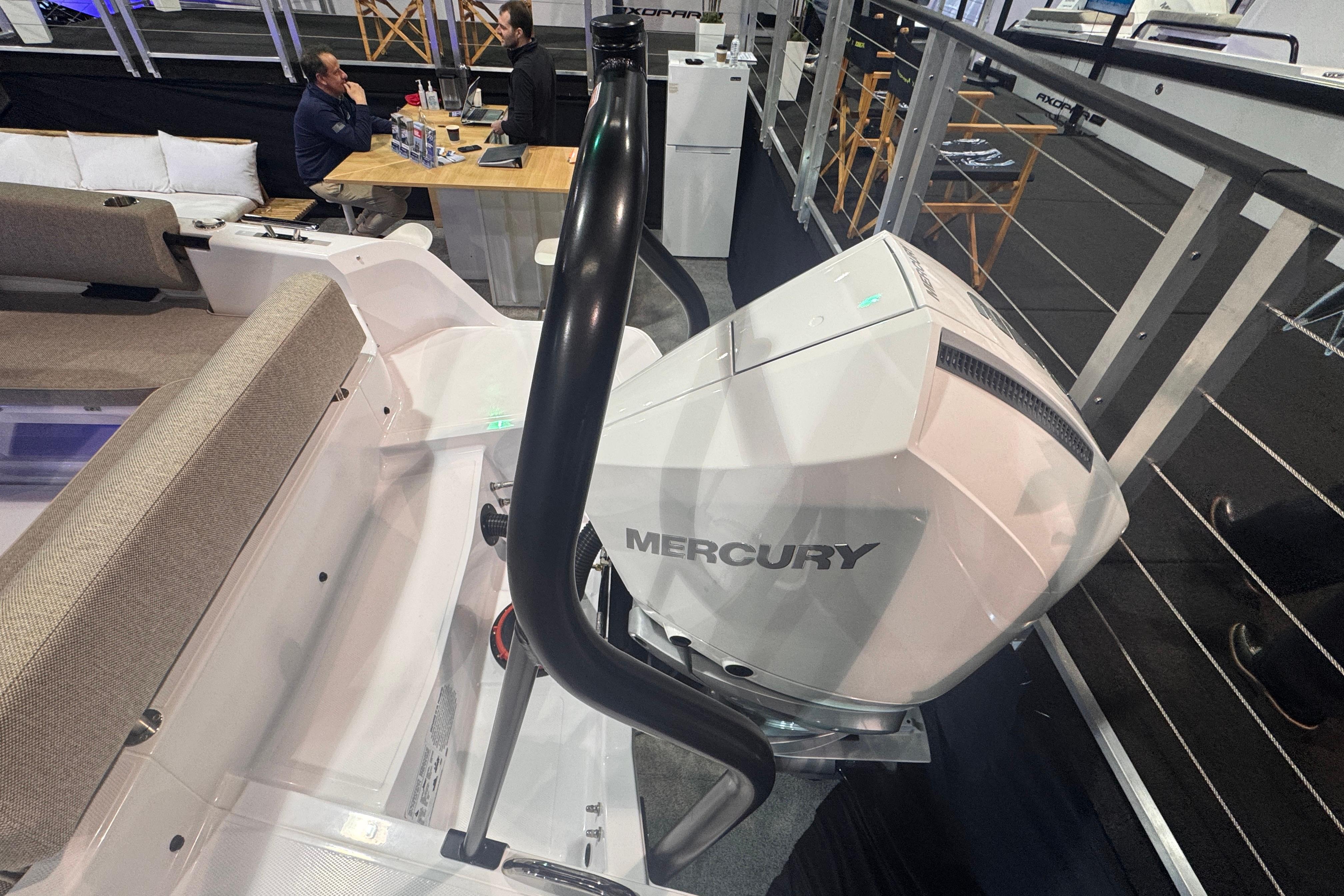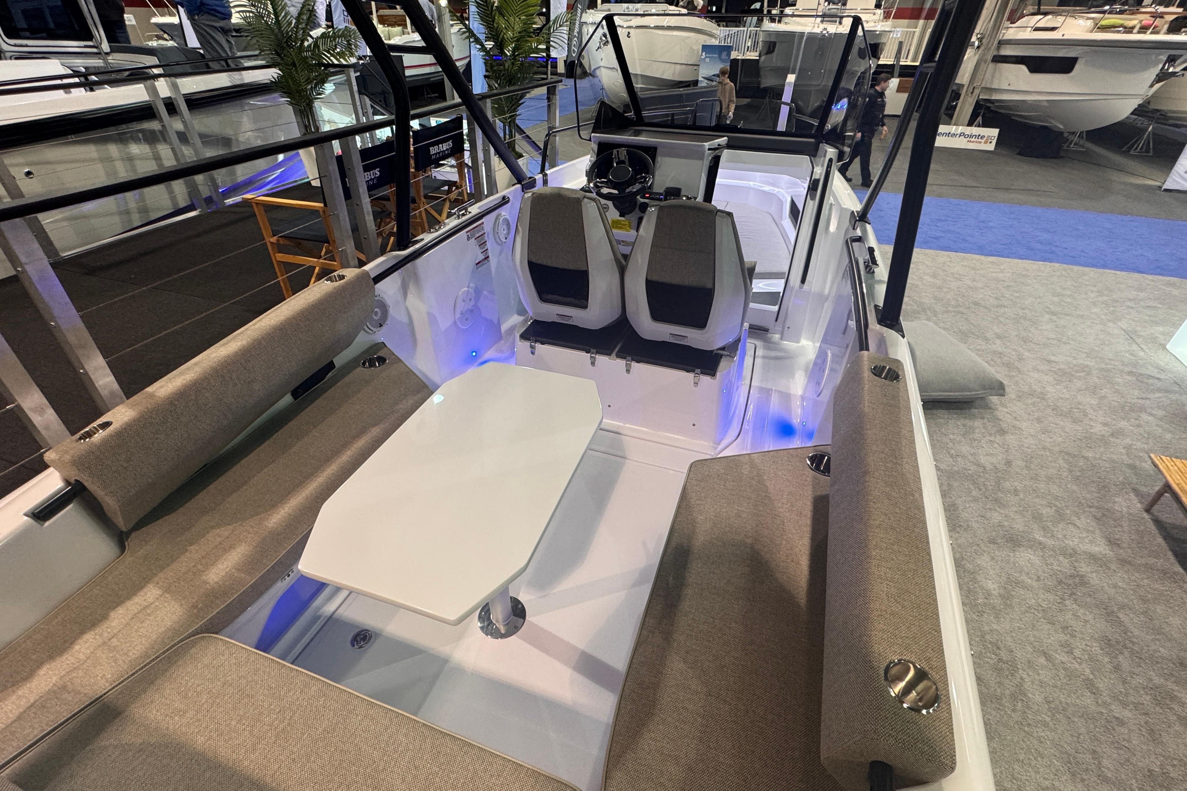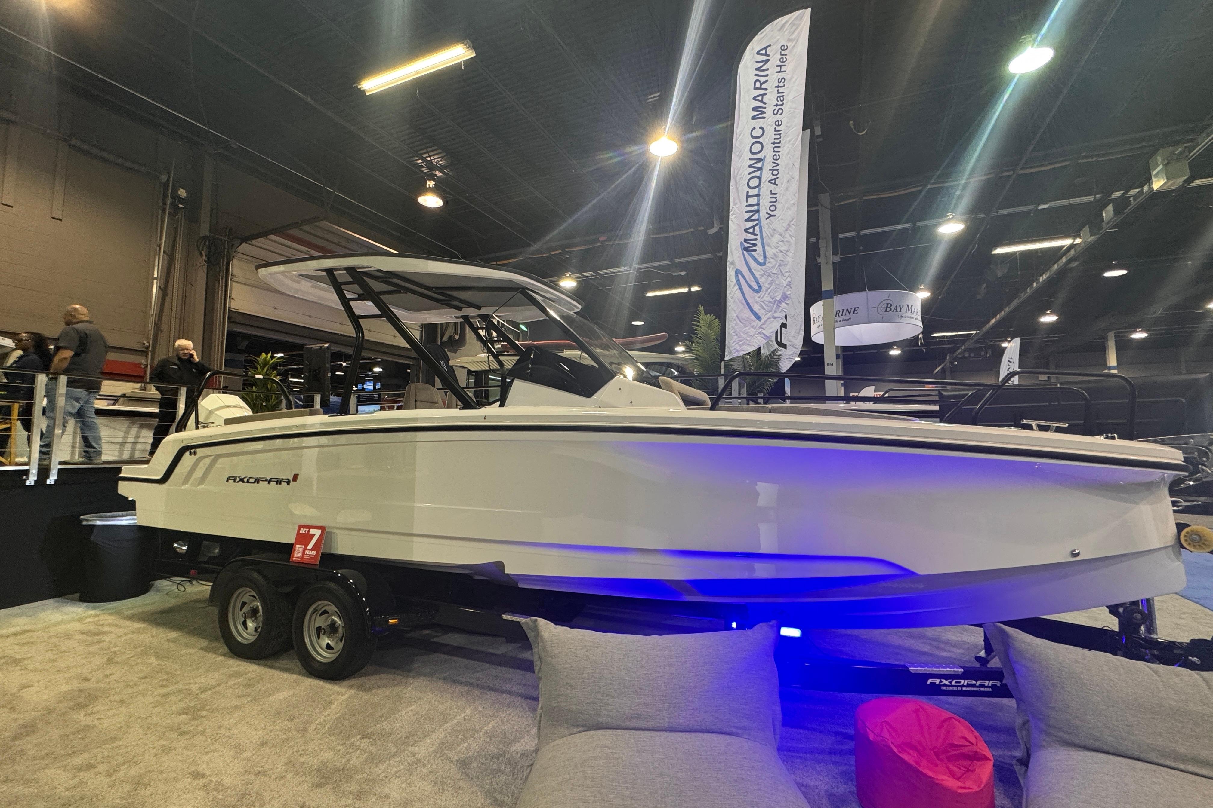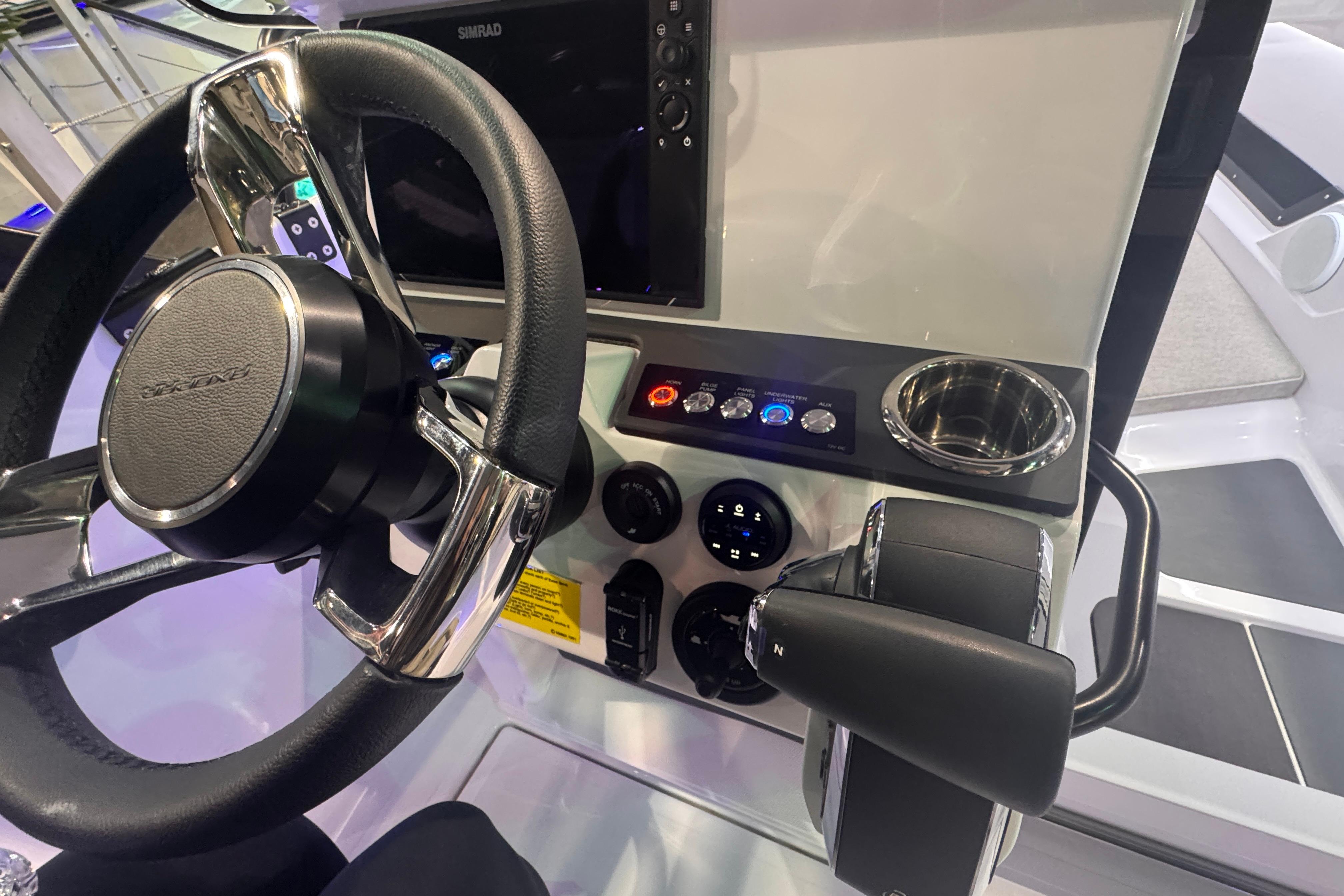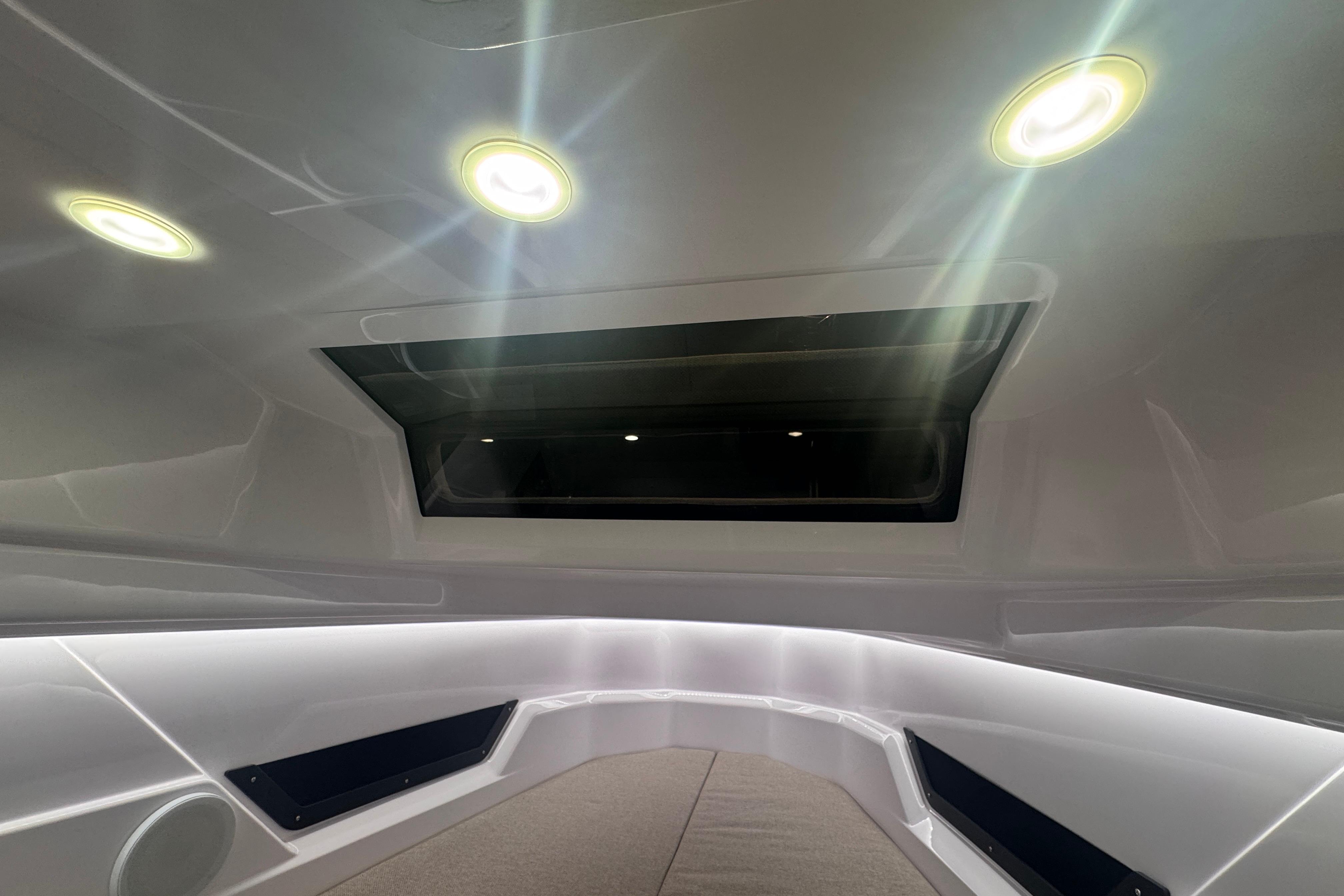 The ultra-cool looking Axopar 25 Cross Bow has a raised ‘cuddy cabin’ sleeping accommodation, where the cabin defines the character of this remarkable new boat. A full width cushioned sundeck is positioned atop the cabin roof, with a sloping back rest that follows the rake of the front screen.