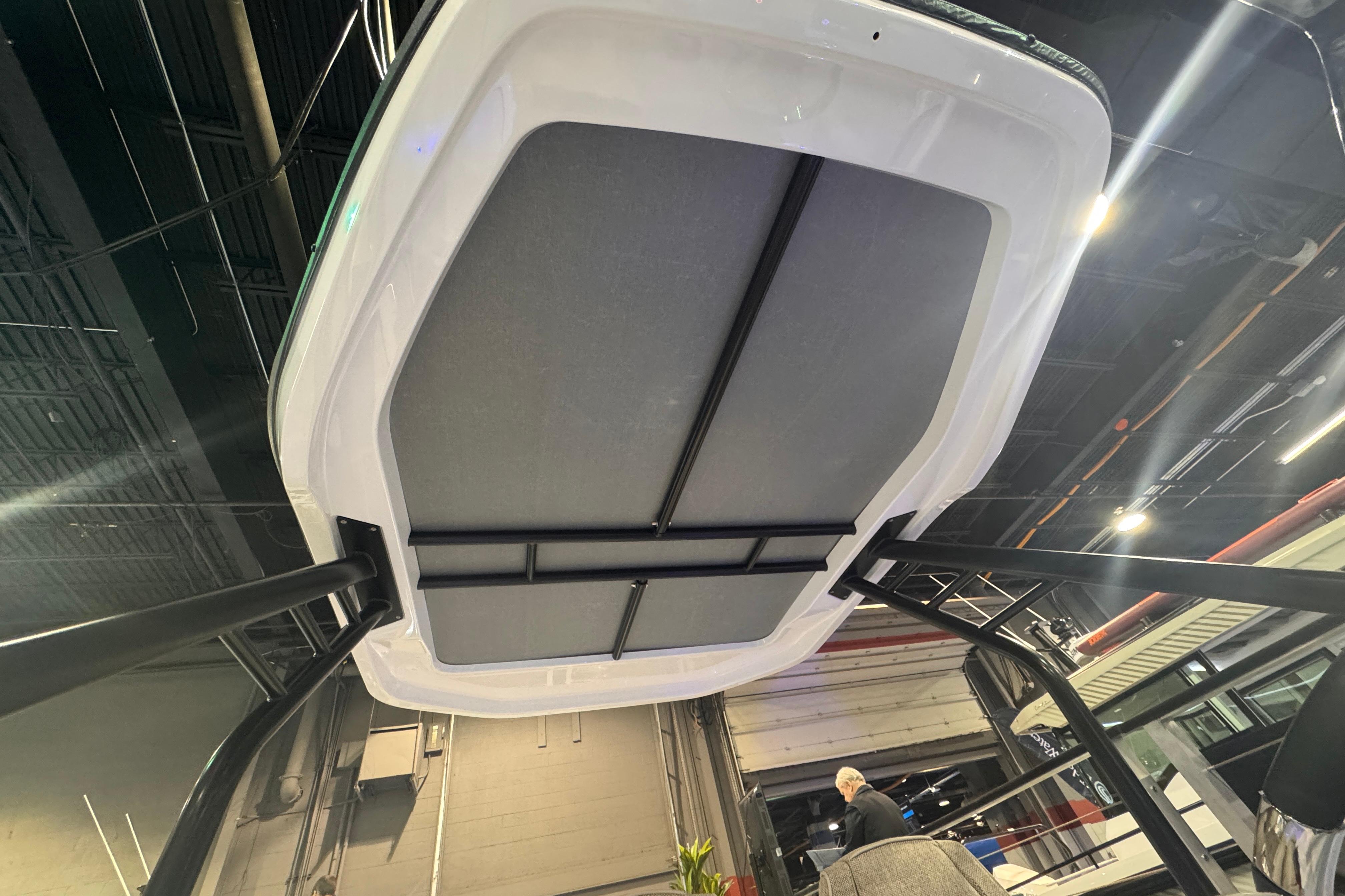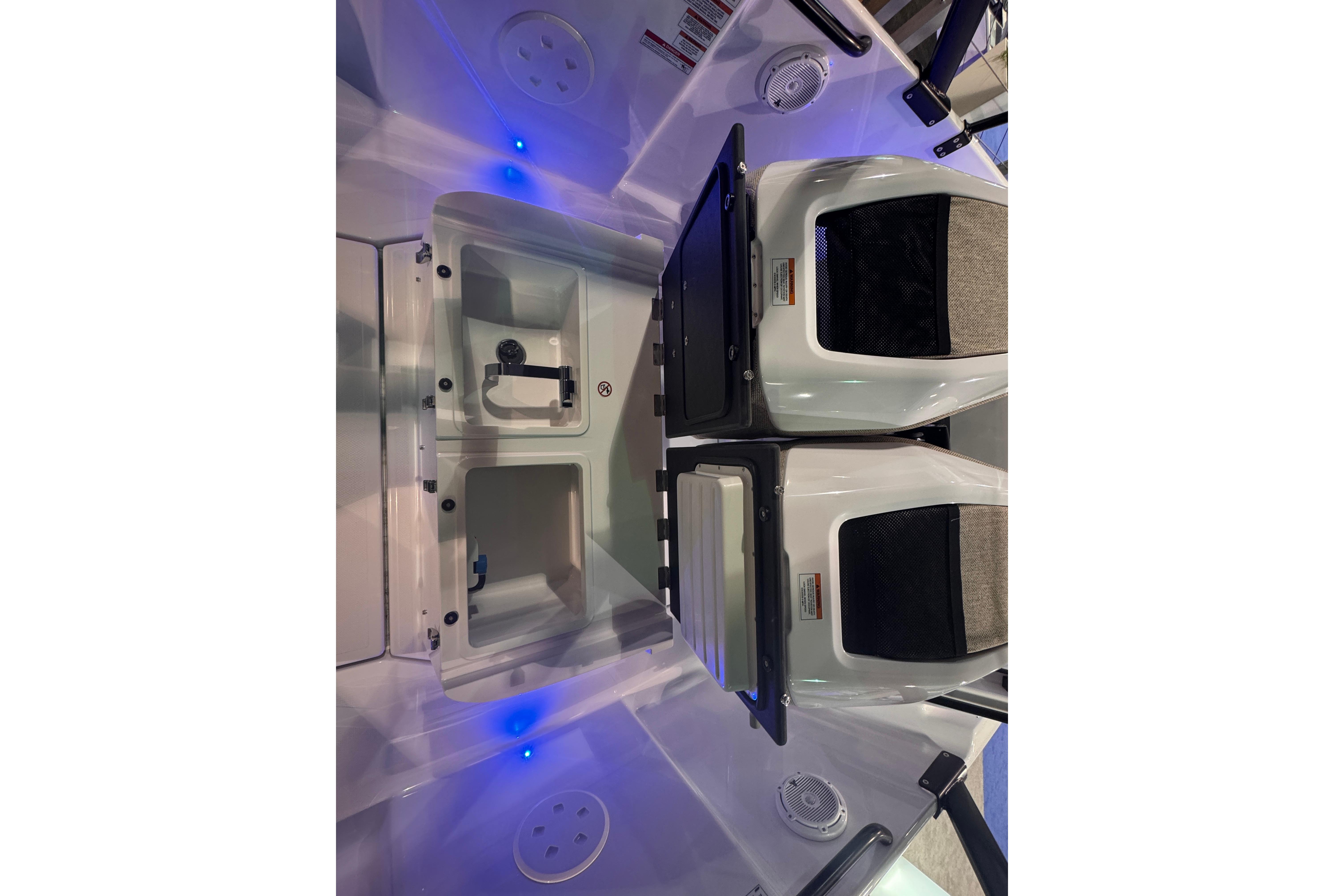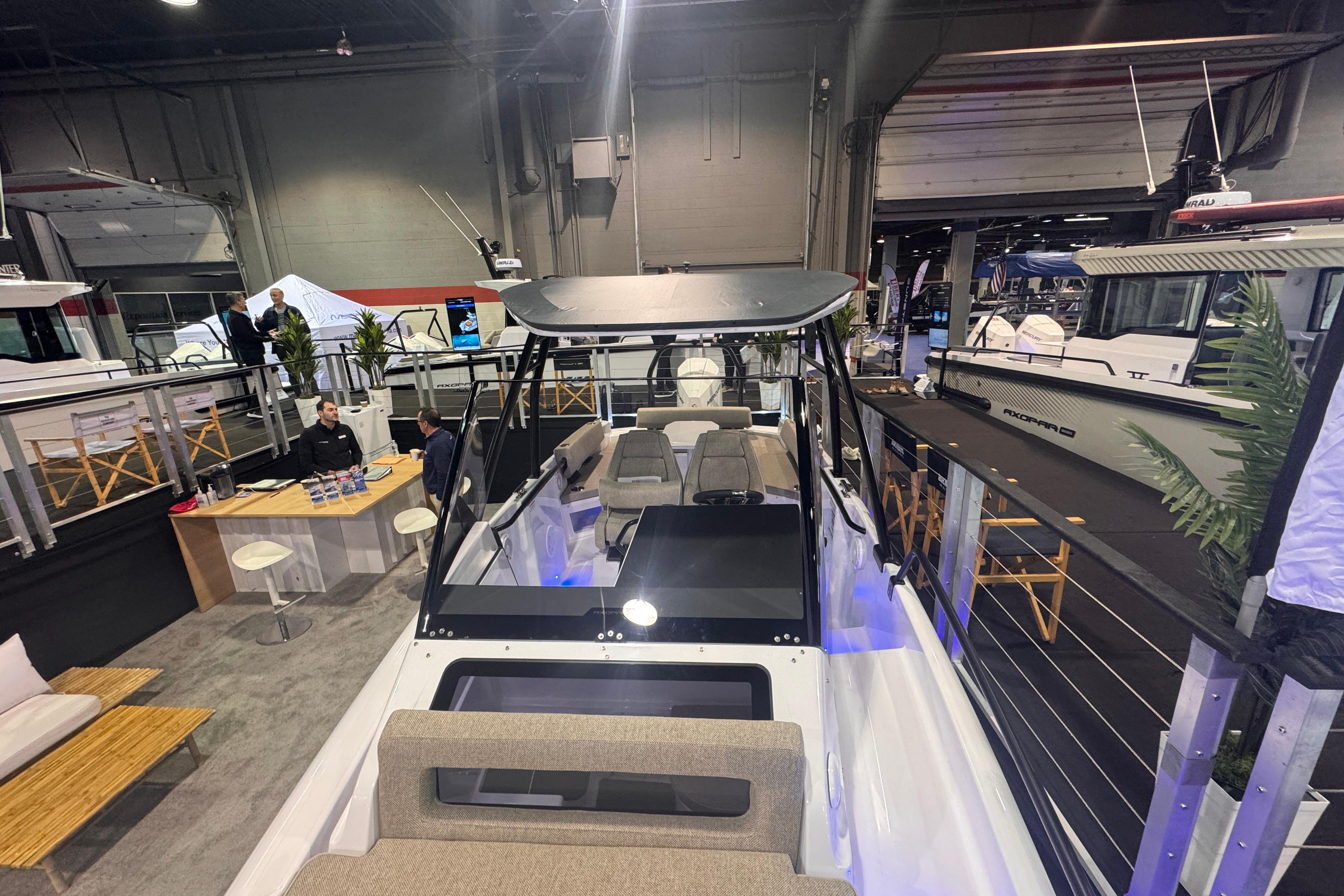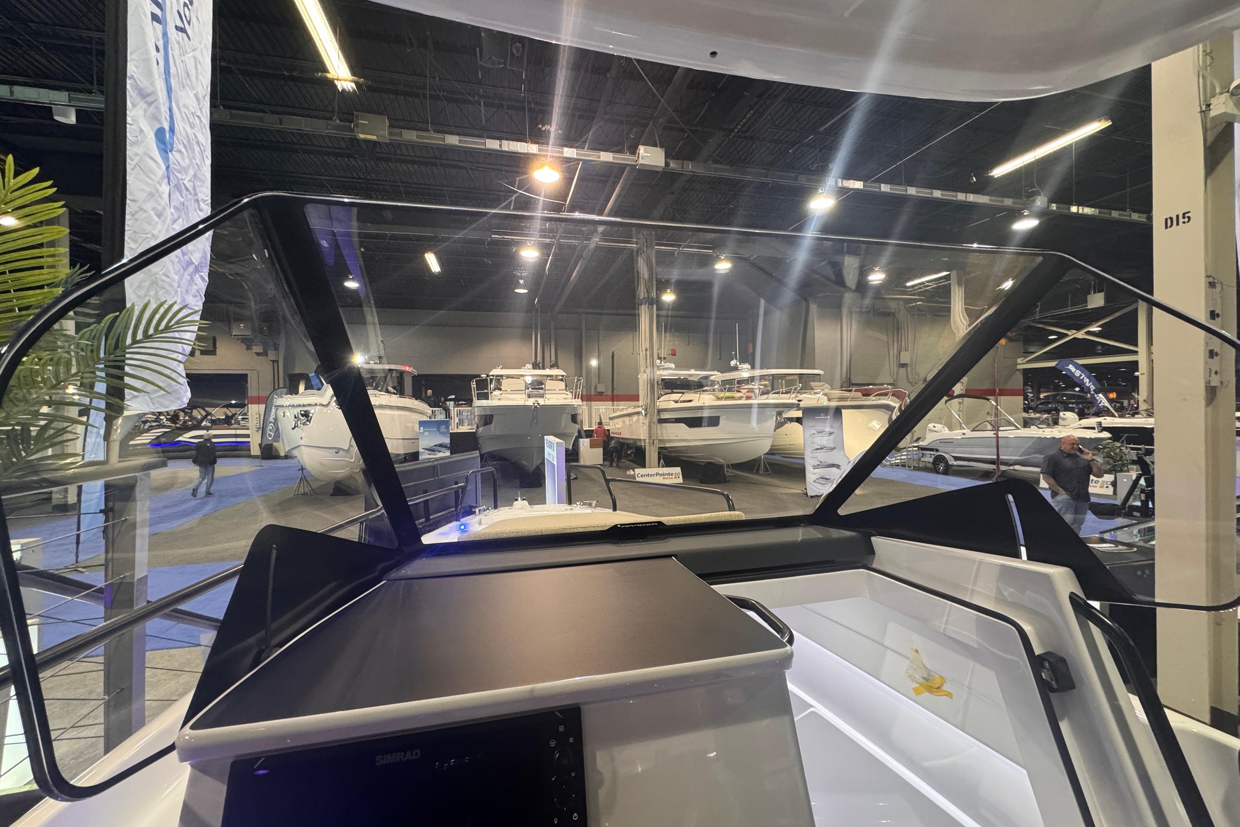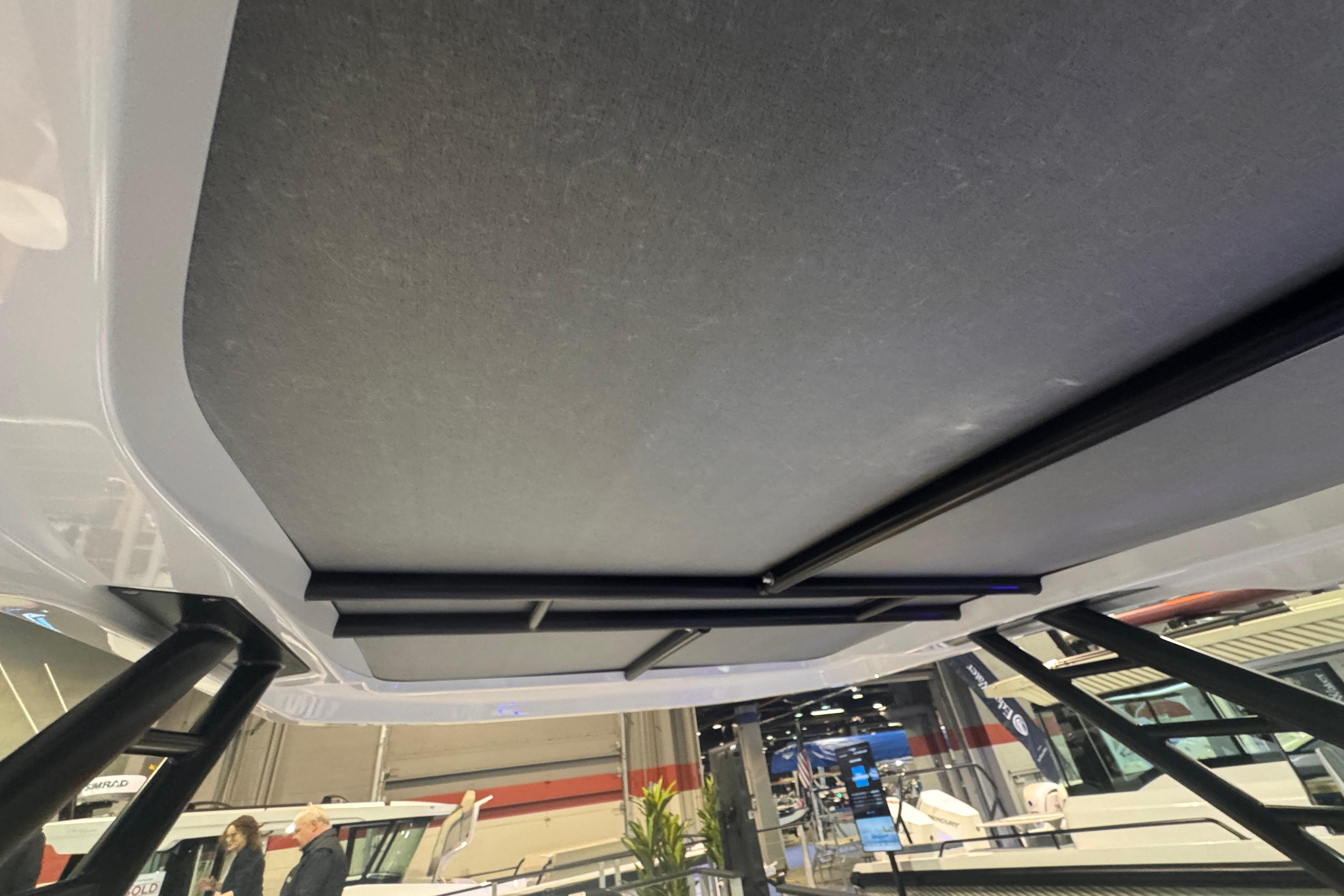 The ultra-cool looking Axopar 25 Cross Bow has a raised ‘cuddy cabin’ sleeping accommodation, where the cabin defines the character of this remarkable new boat. A full width cushioned sundeck is positioned atop the cabin roof, with a sloping back rest that follows the rake of the front screen.