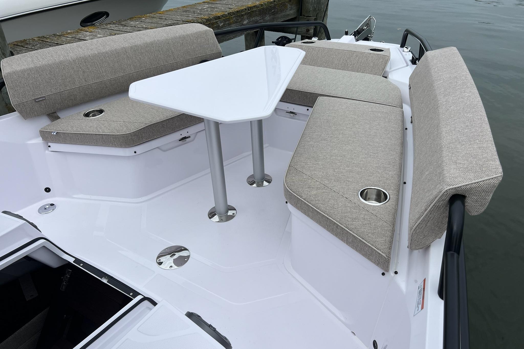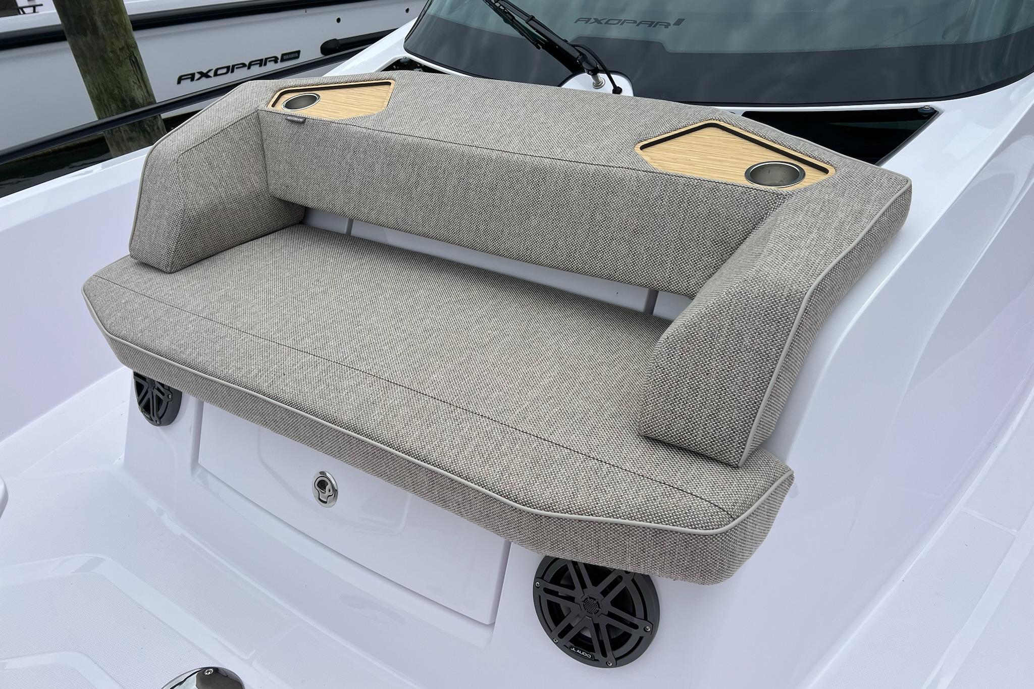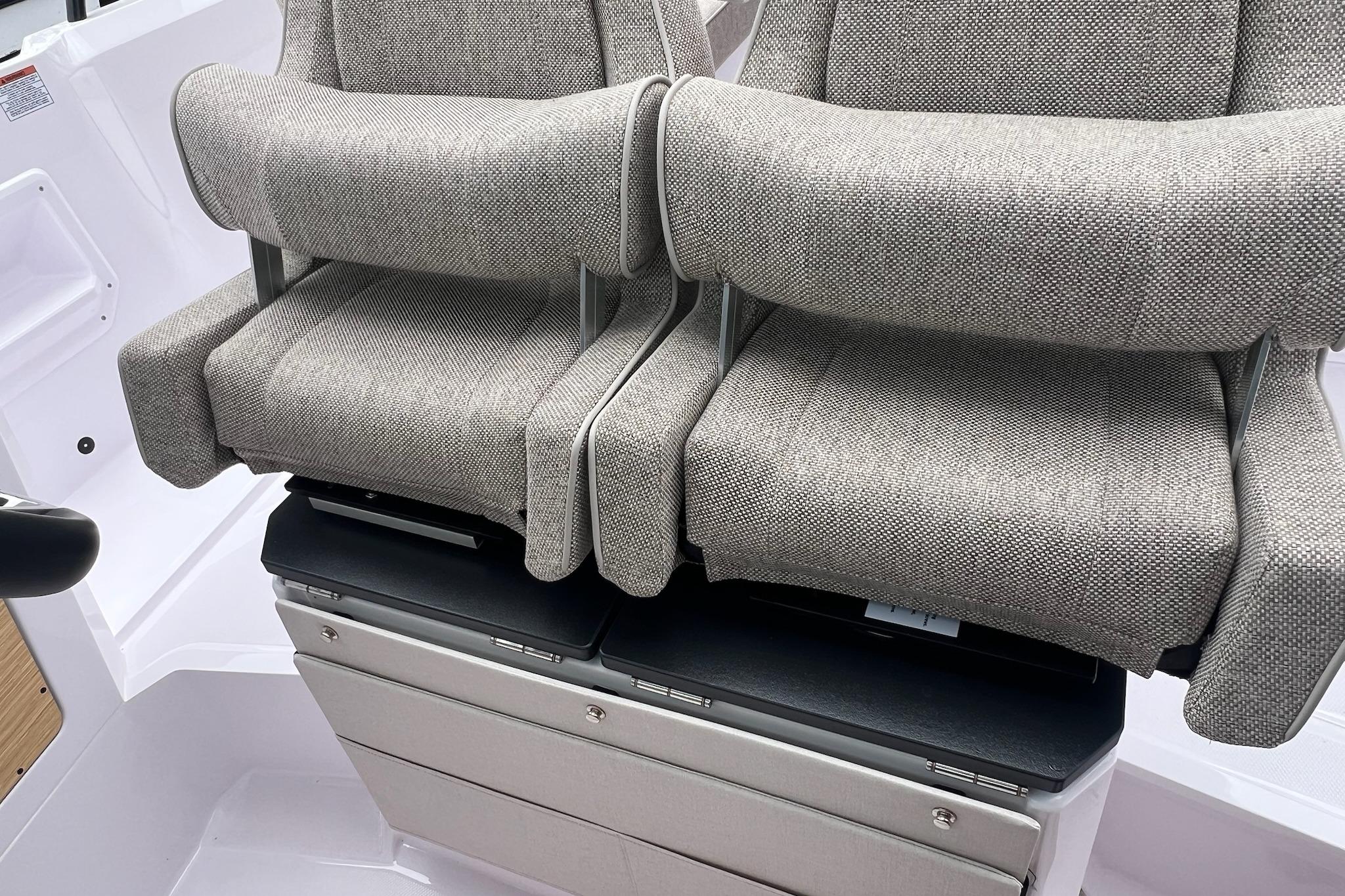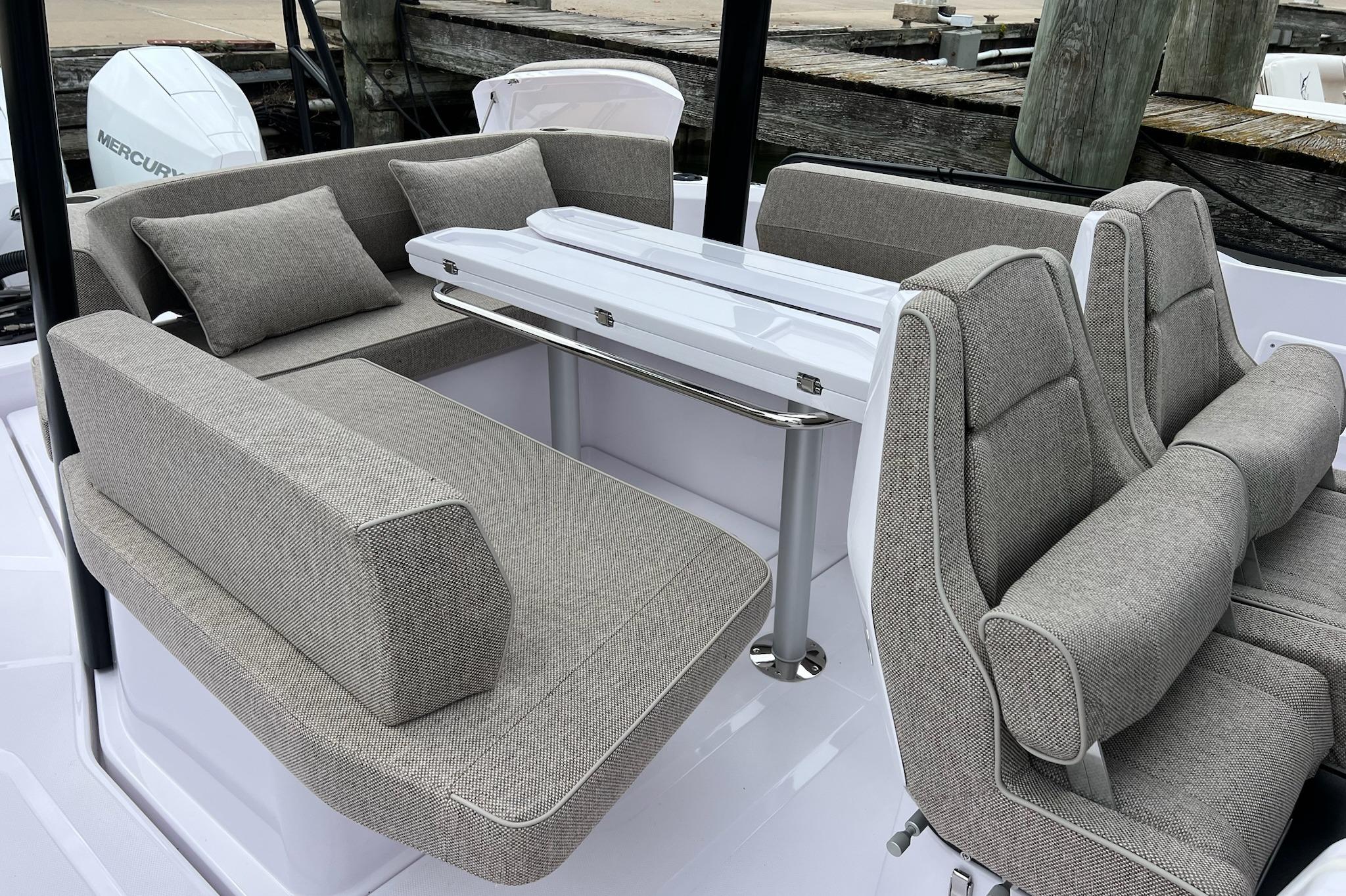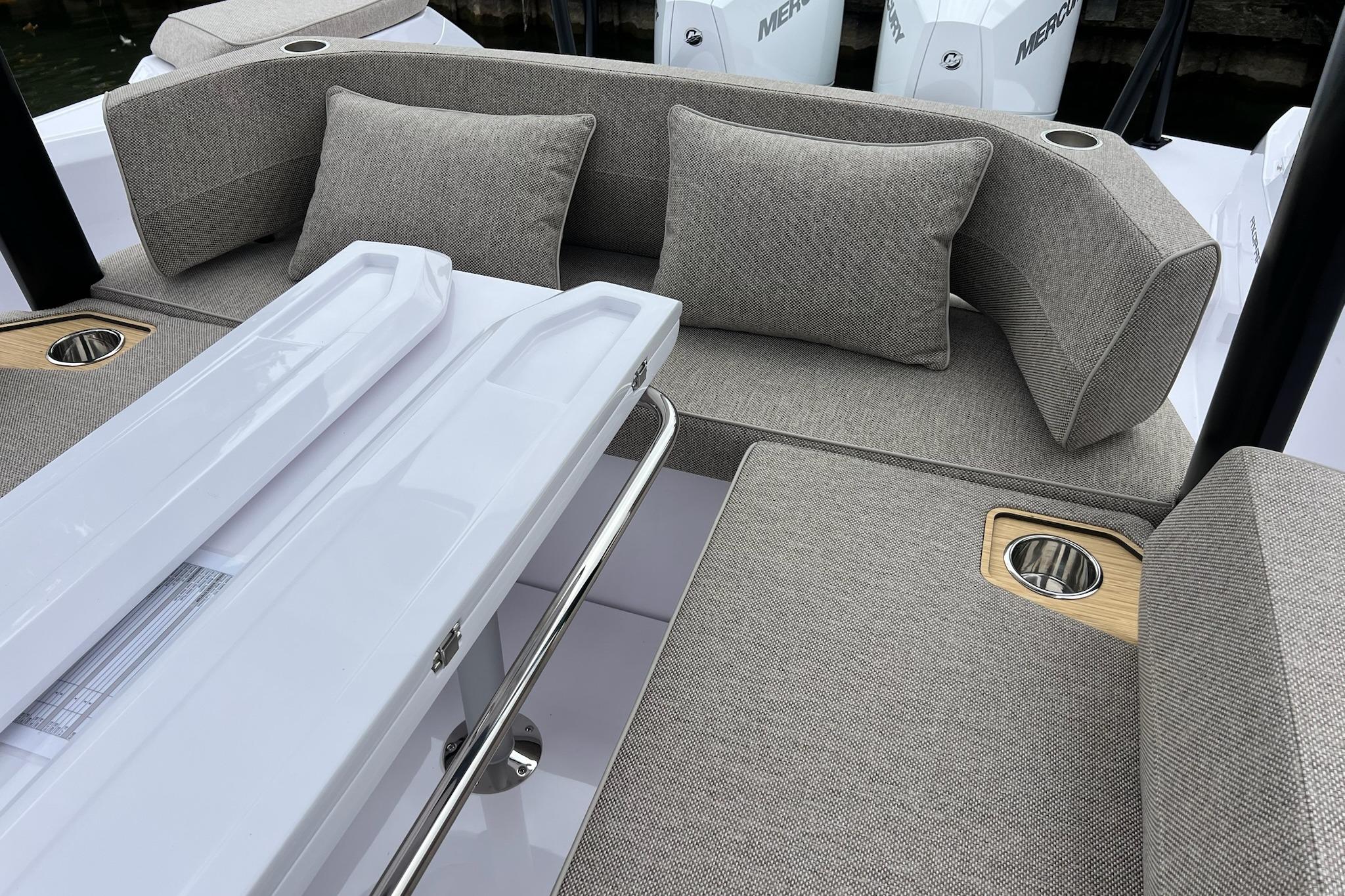 At the helm are twin Simrad NSX 12", integrated echo sounder, bow thruster, and VHF radio. Behind the helm you will find a centralized social gathering area. The u-shaped sofa present behind the helm seats allows for shaded dining, for up to 6 guests.