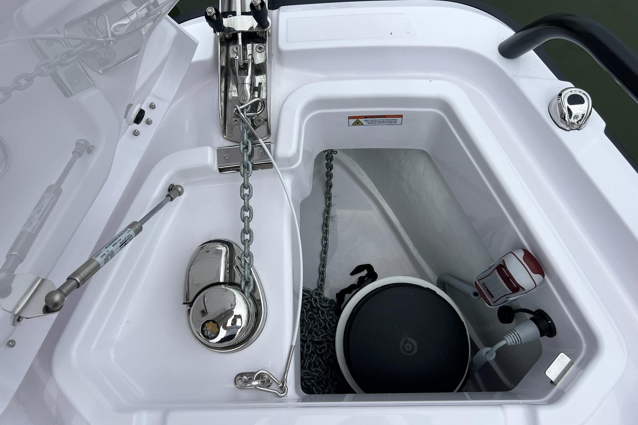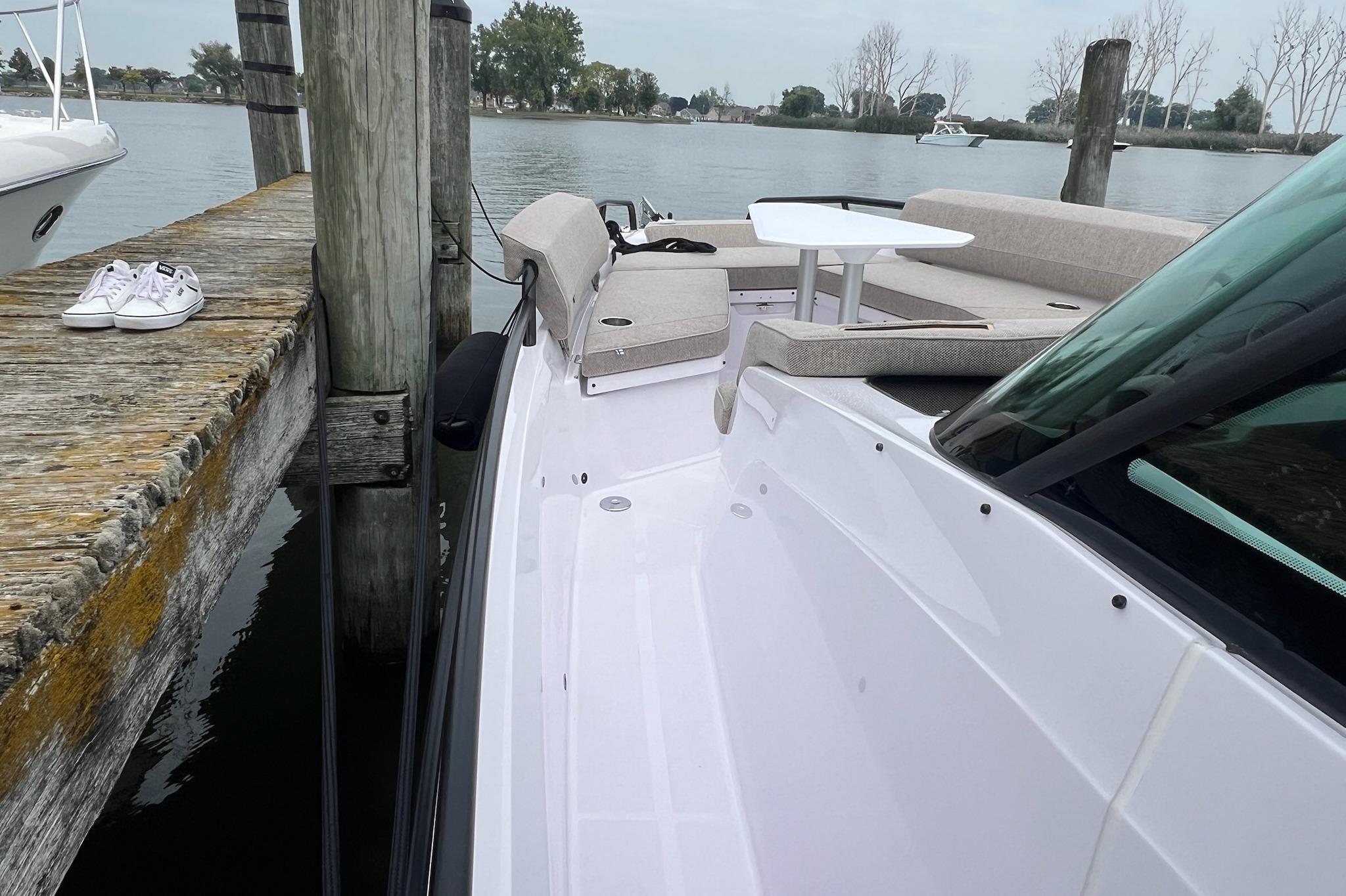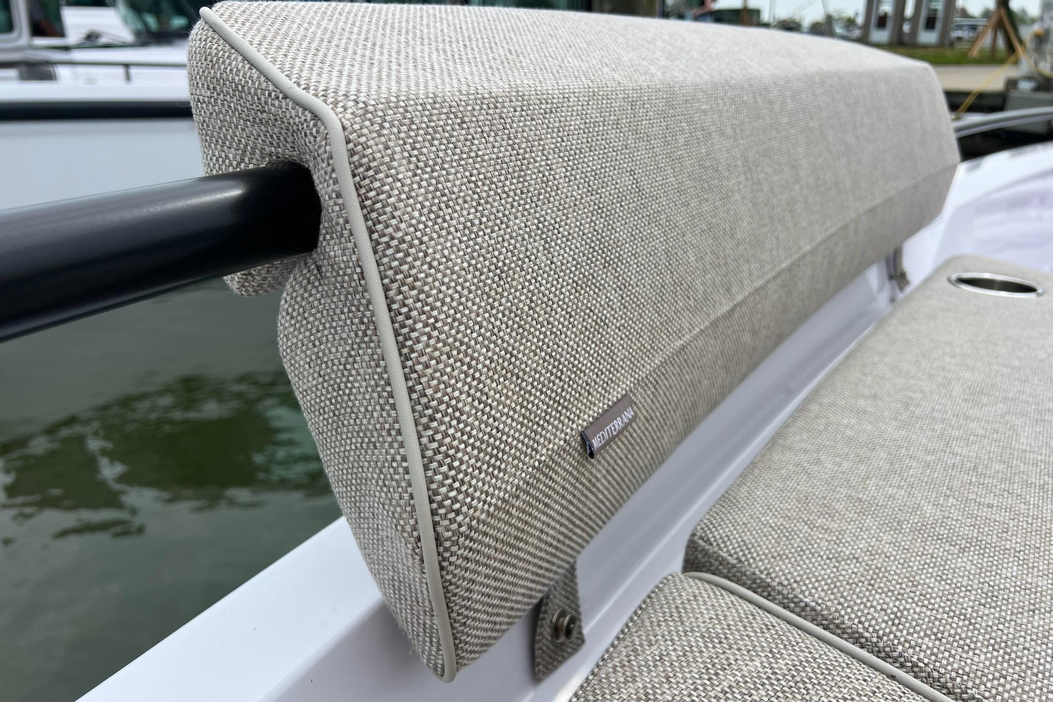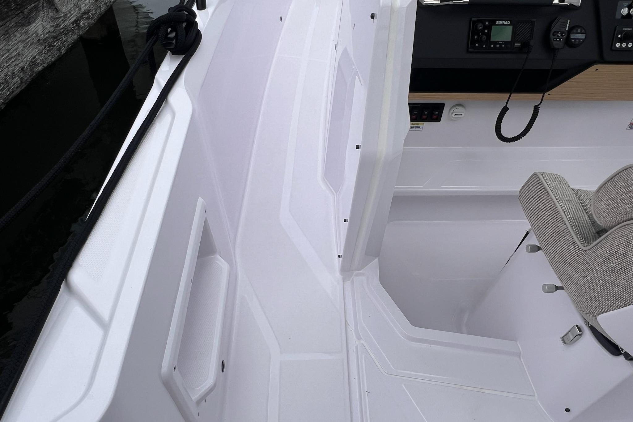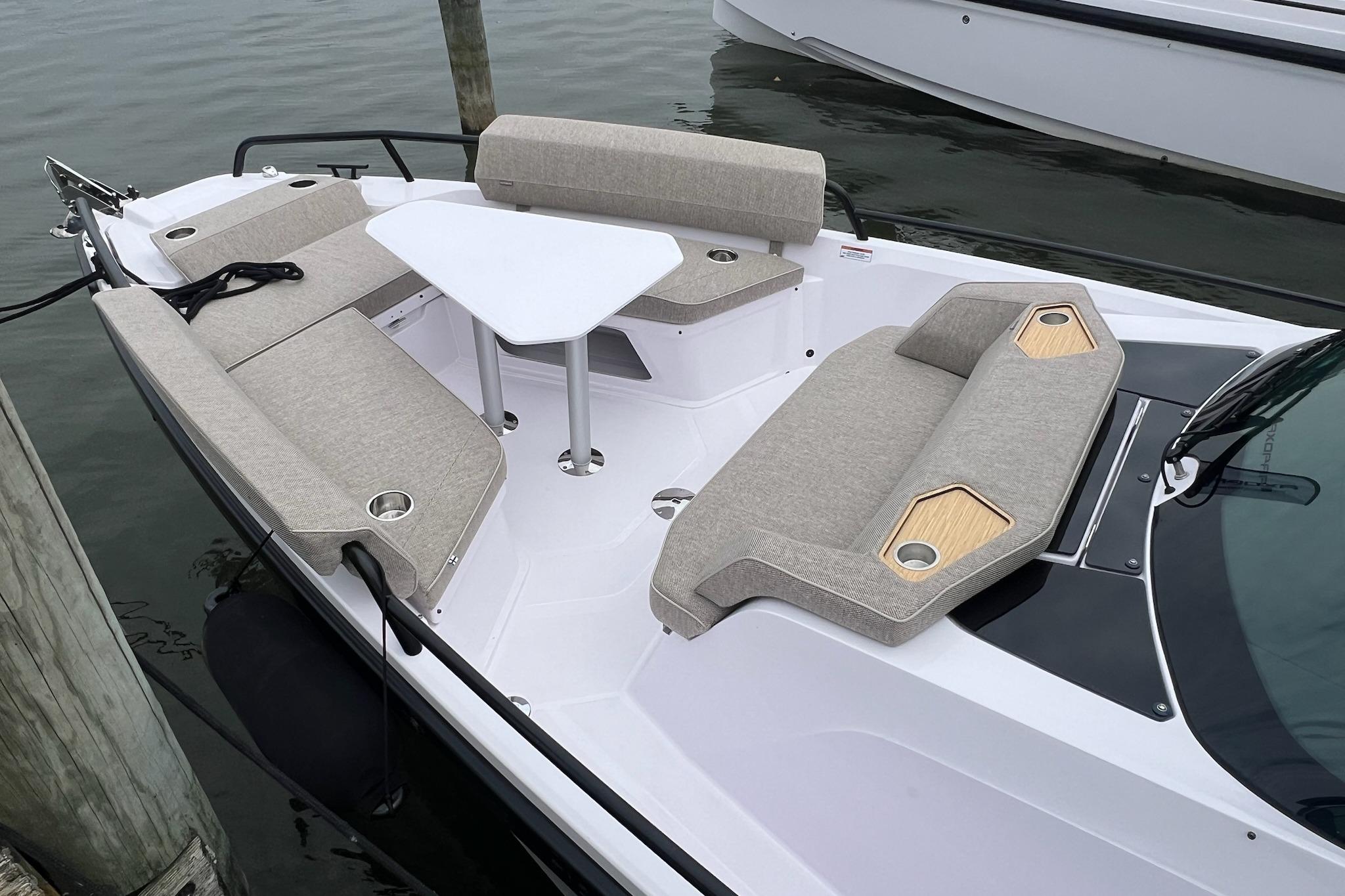 At the helm are twin Simrad NSX 12", integrated echo sounder, bow thruster, and VHF radio. Behind the helm you will find a centralized social gathering area. The u-shaped sofa present behind the helm seats allows for shaded dining, for up to 6 guests.