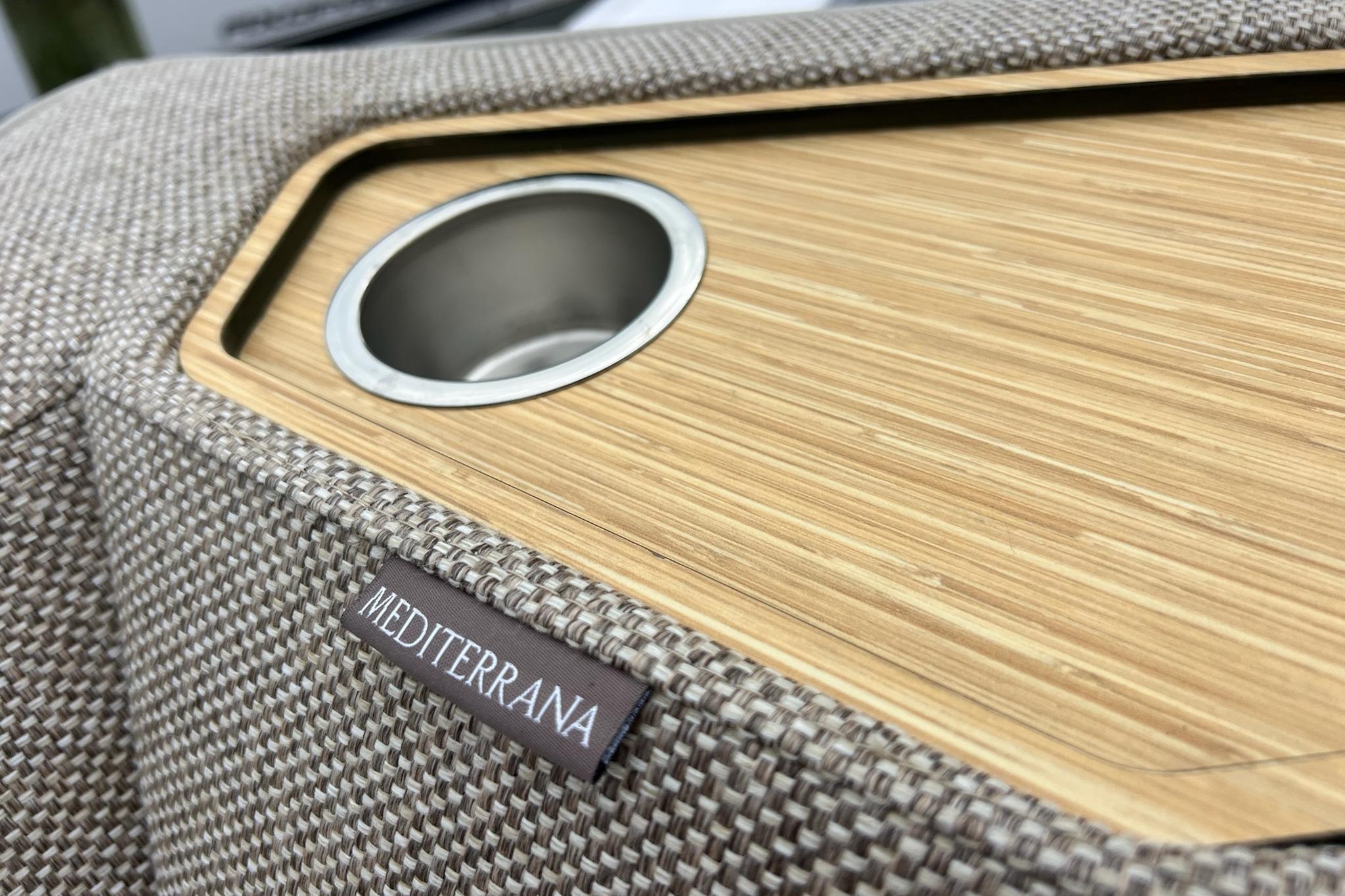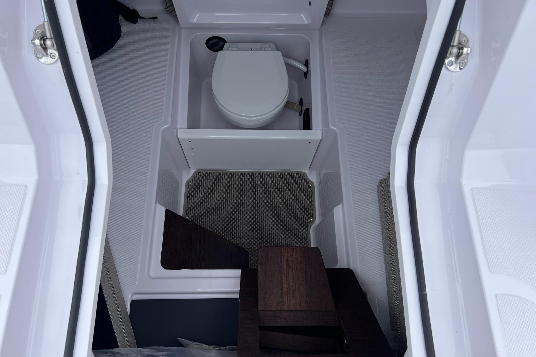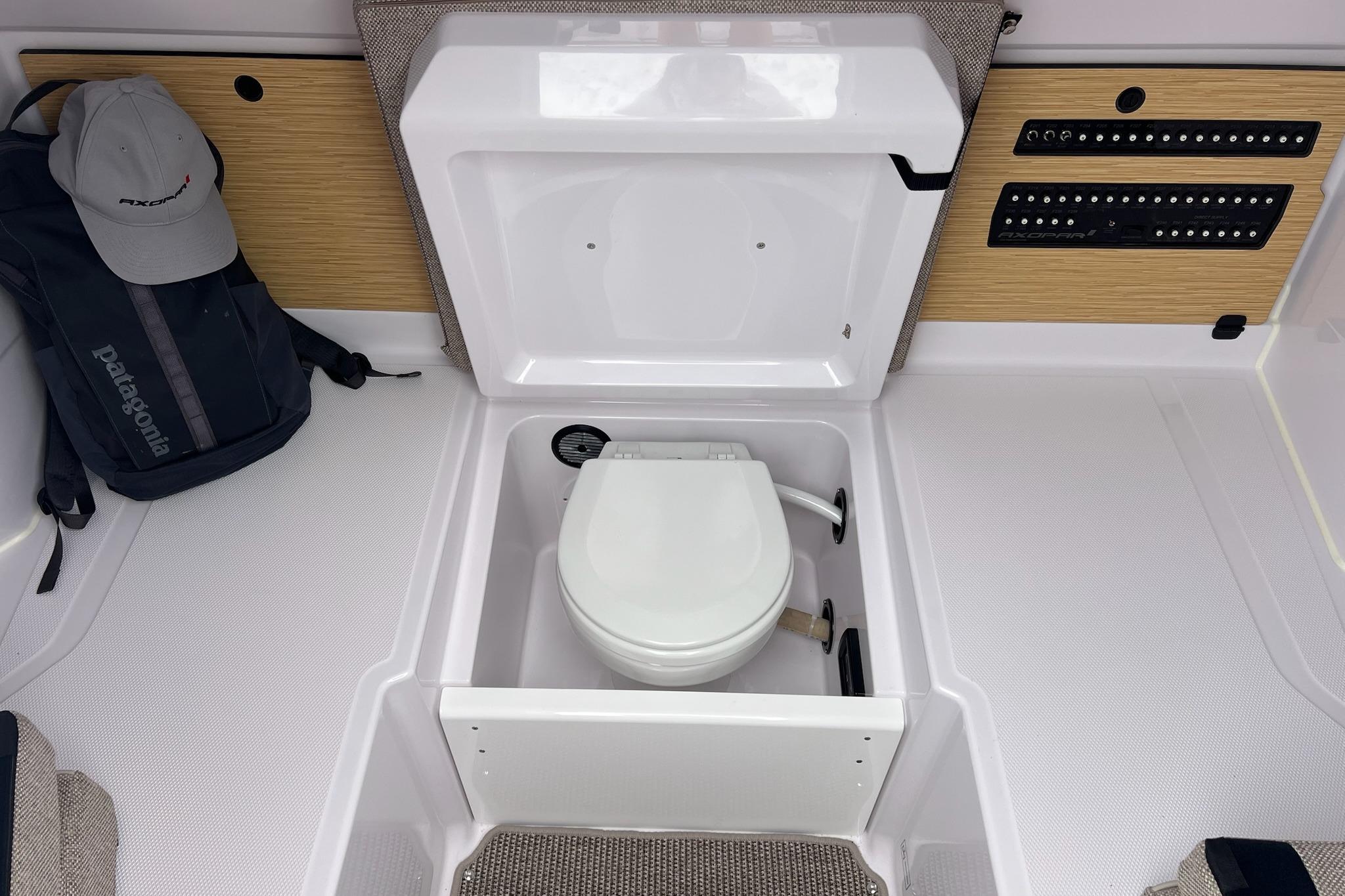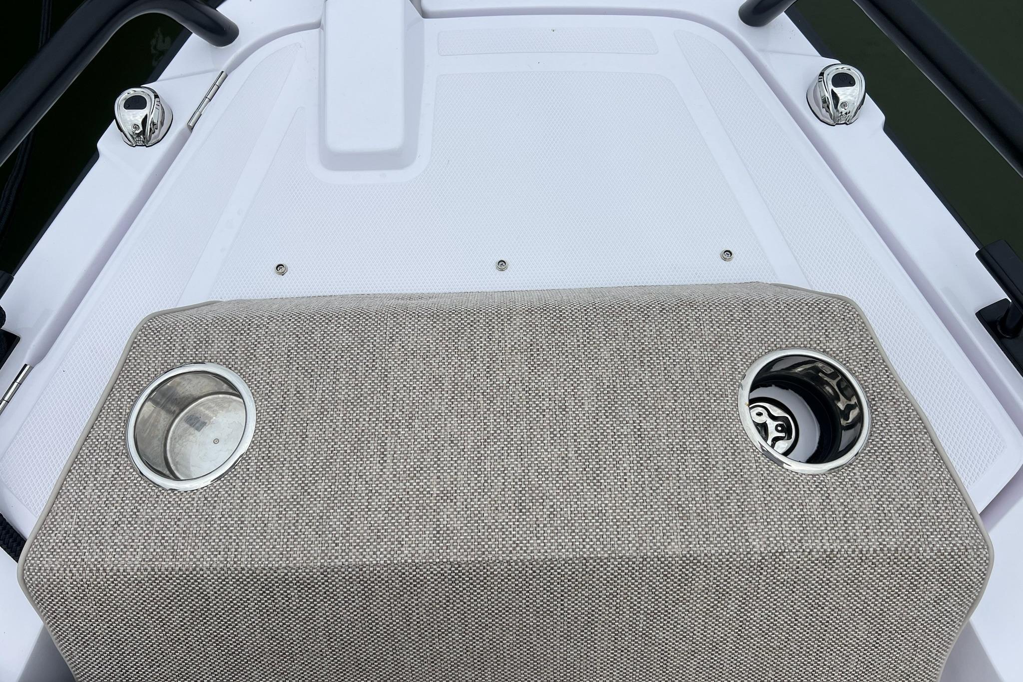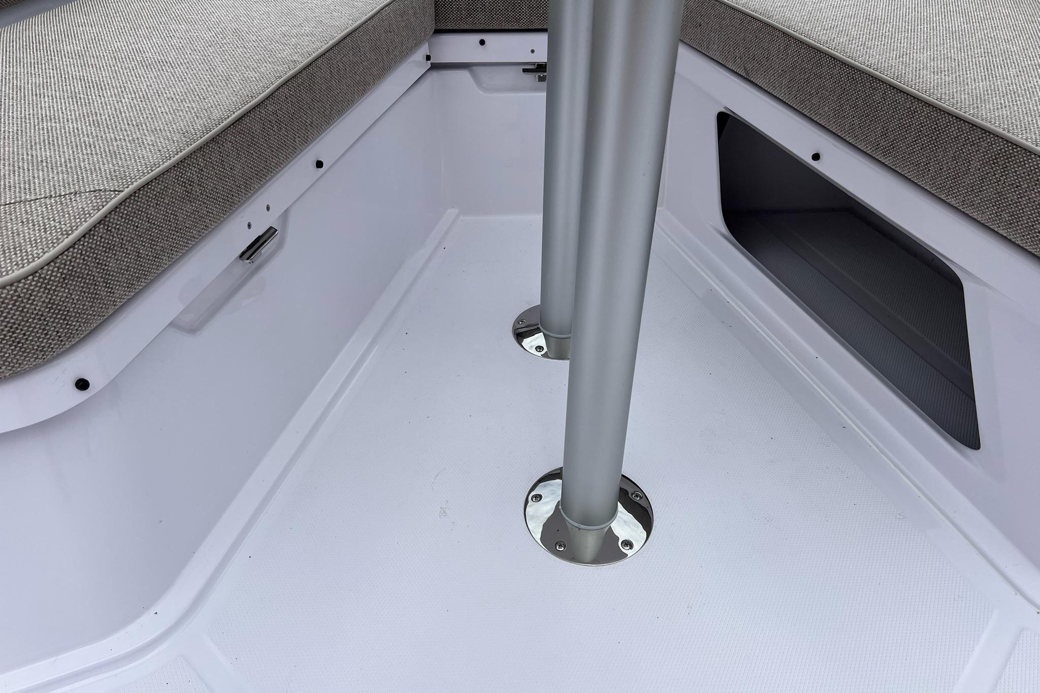 At the helm are twin Simrad NSX 12", integrated echo sounder, bow thruster, and VHF radio. Behind the helm you will find a centralized social gathering area. The u-shaped sofa present behind the helm seats allows for shaded dining, for up to 6 guests.