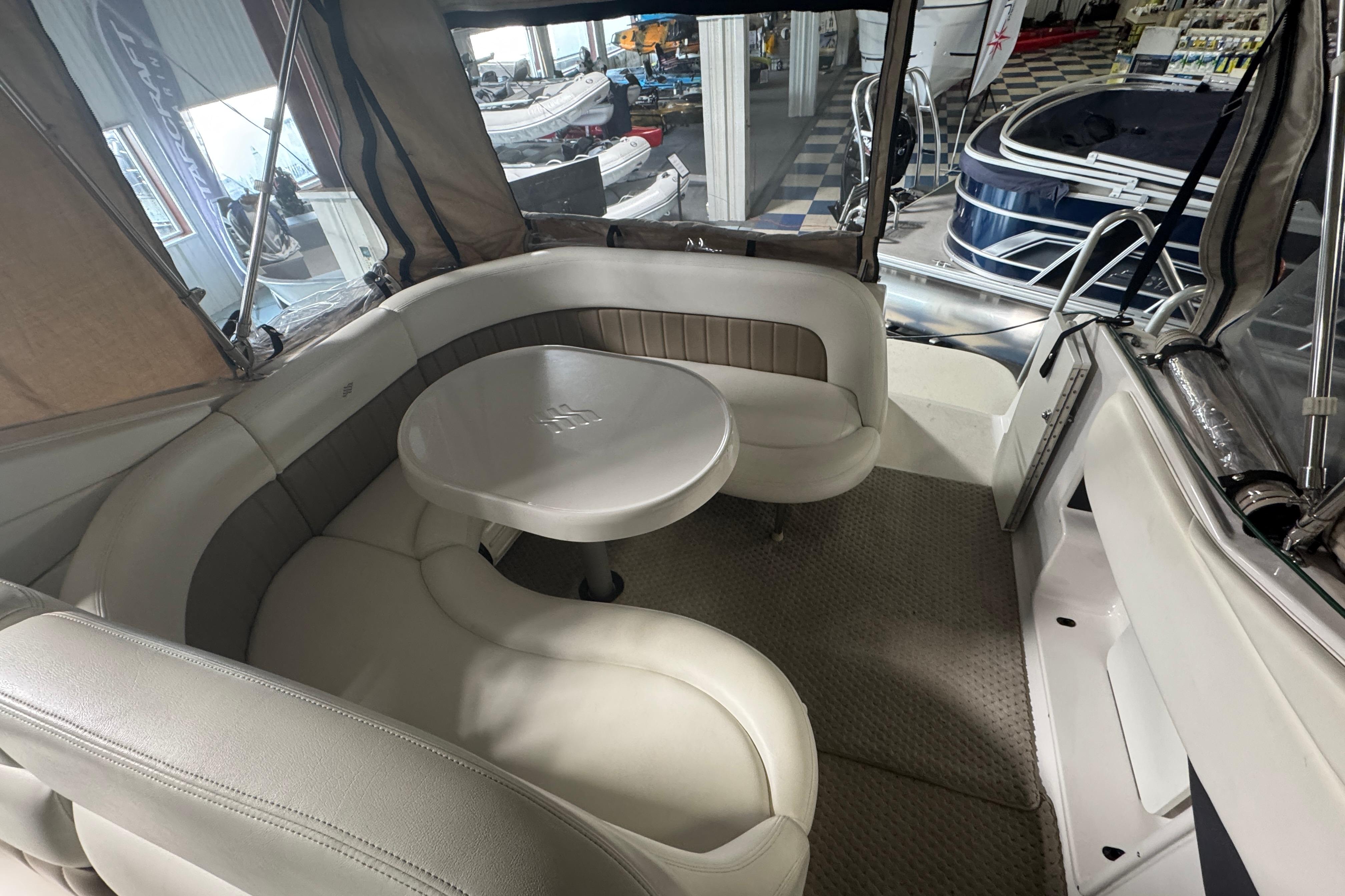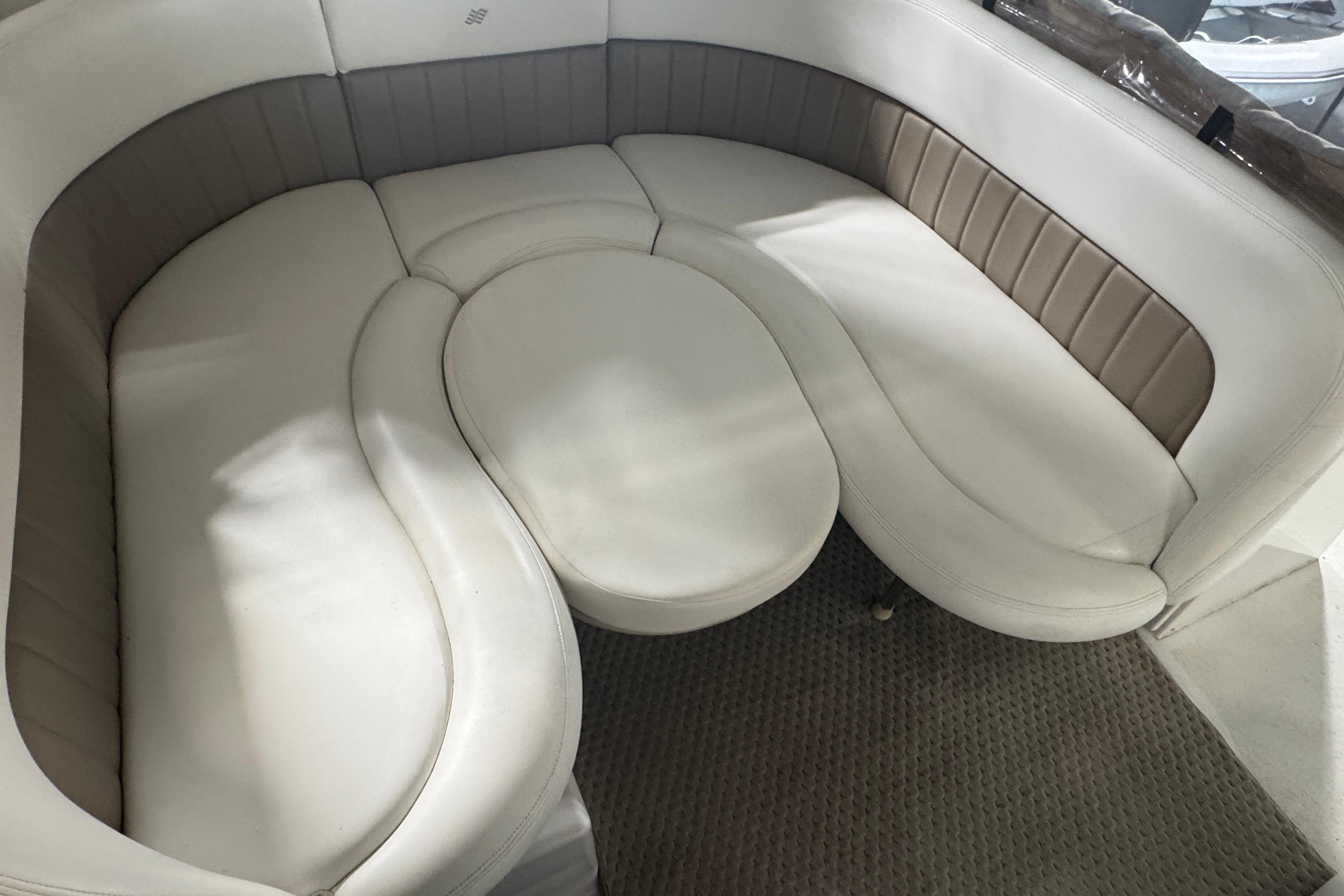 The cockpit is designed for relaxation and entertainment, featuring wraparound seating, a bimini top and full cockpit cover, and an extended swim platform for easy boarding and watersports.