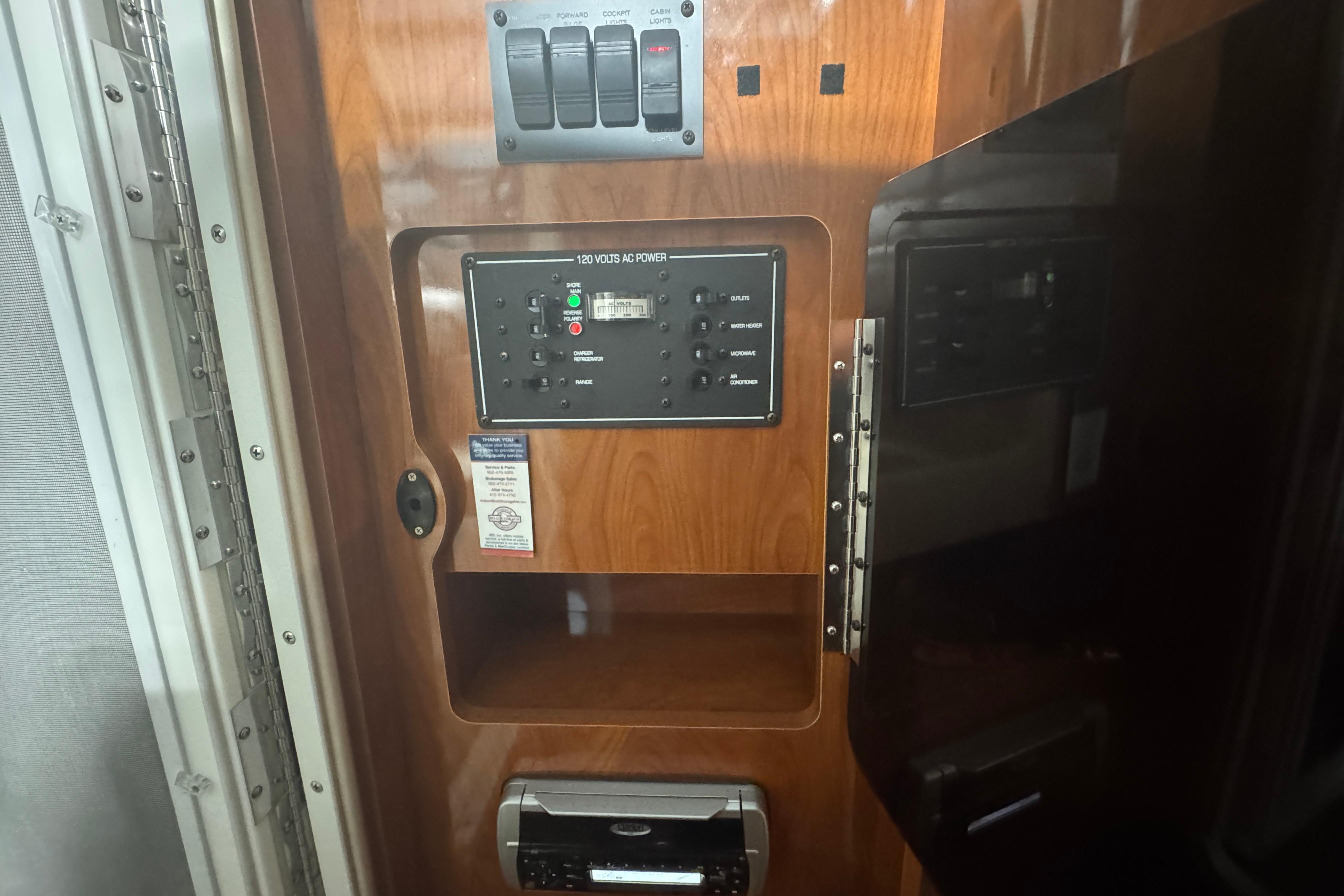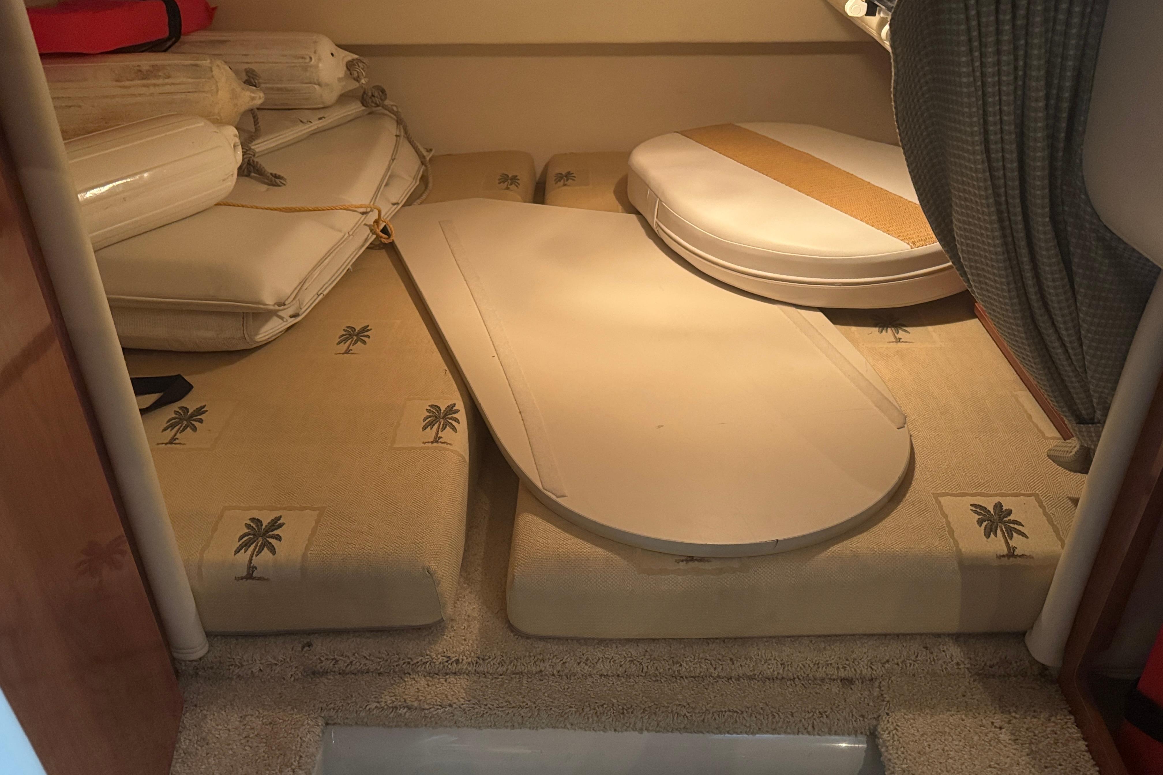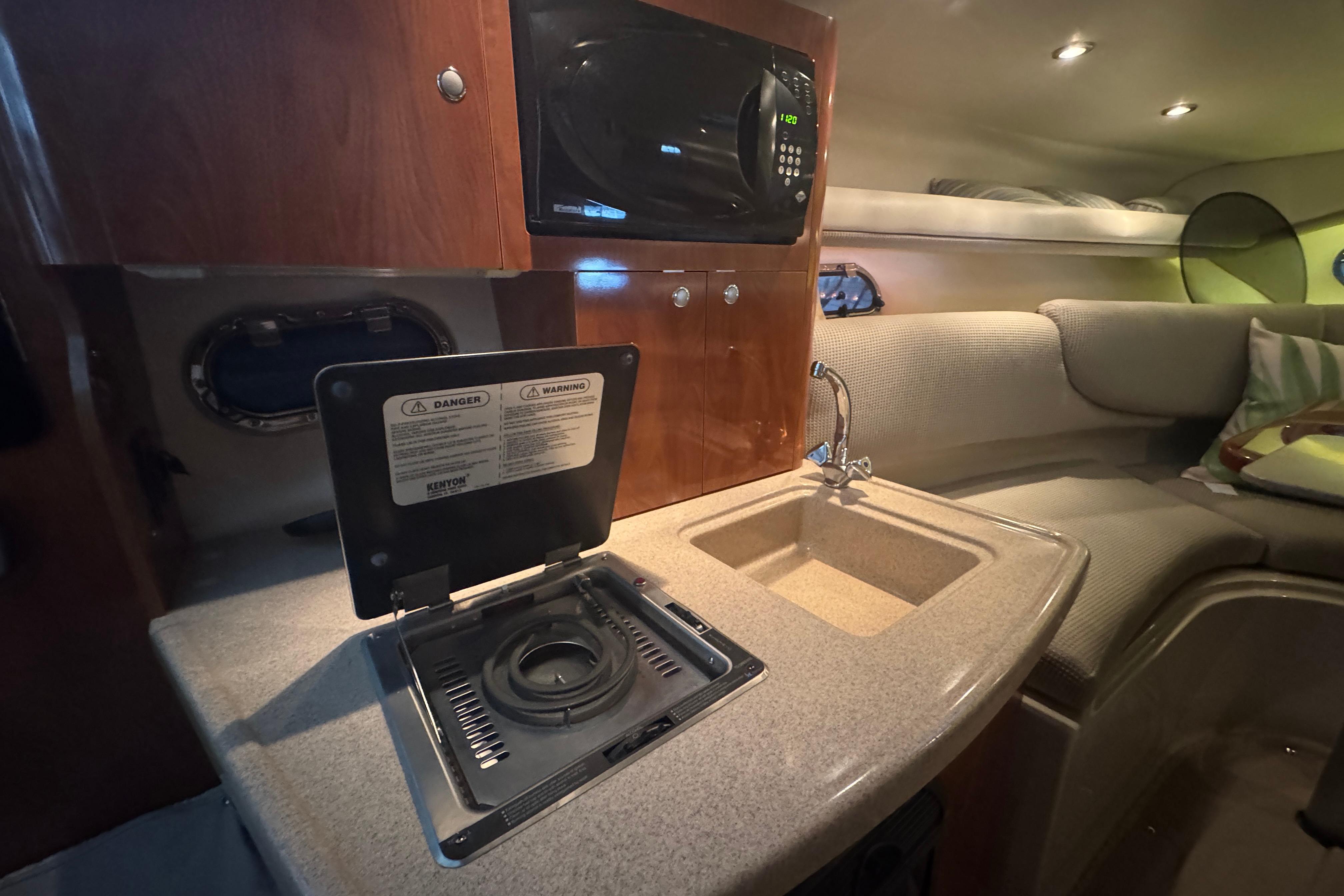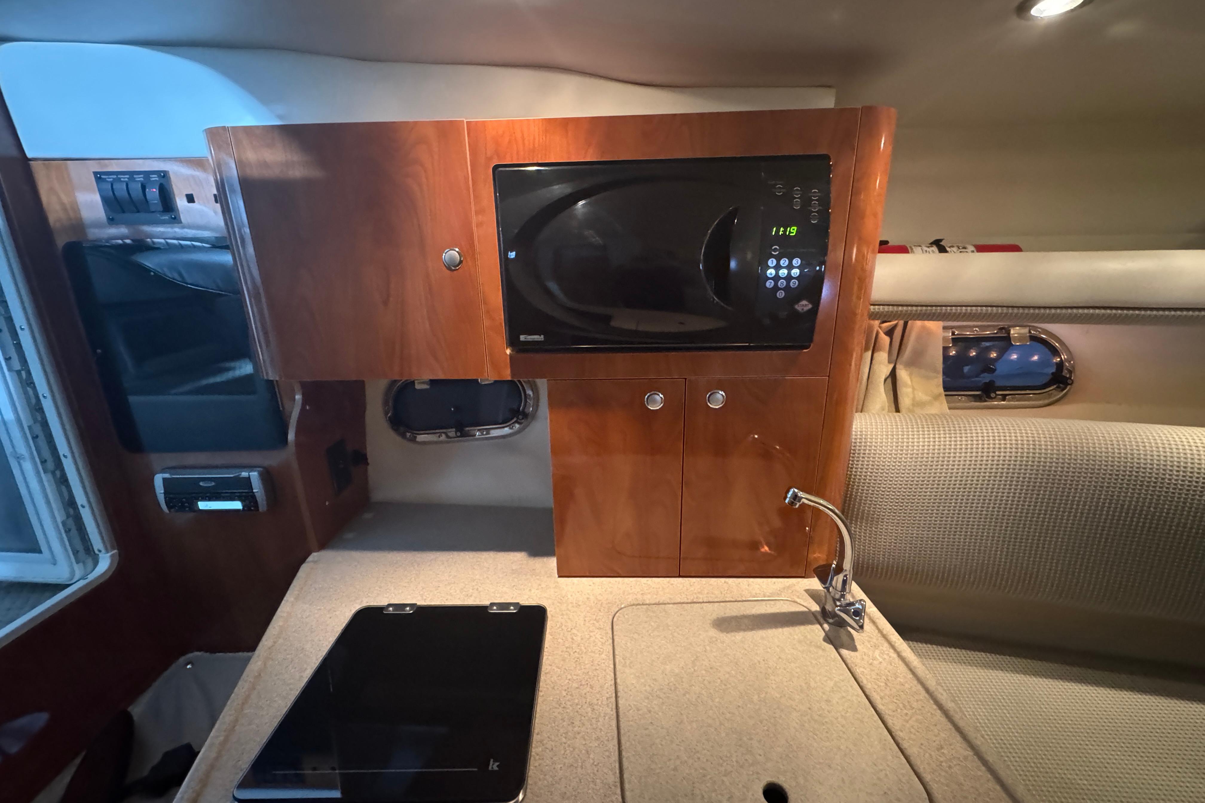 Below deck, the bright and inviting cabin features a fully equipped galley with refrigerator, microwave, stove, and sink, plus a private head with hot water and ample storage. The convertible dinette offers comfortable overnight accommodations for family or friends.
